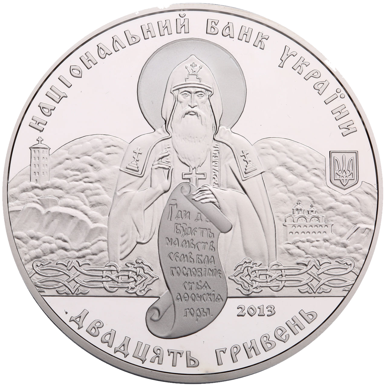 На аверсі монети розміщено: угорі напис півколом НАЦІОНАЛЬНИЙ БАНК УКРАЇНИ, праворуч - малий Державний Герб України, стилізовану композицію, у центрі якої - Антоній Печерський на тлі скель, що нагадують крила, унизу - давньоруський орнамент і напис півколом ДВАДЦЯТЬ ГРИВЕНЬ, праворуч - рік карбування монети 2013.