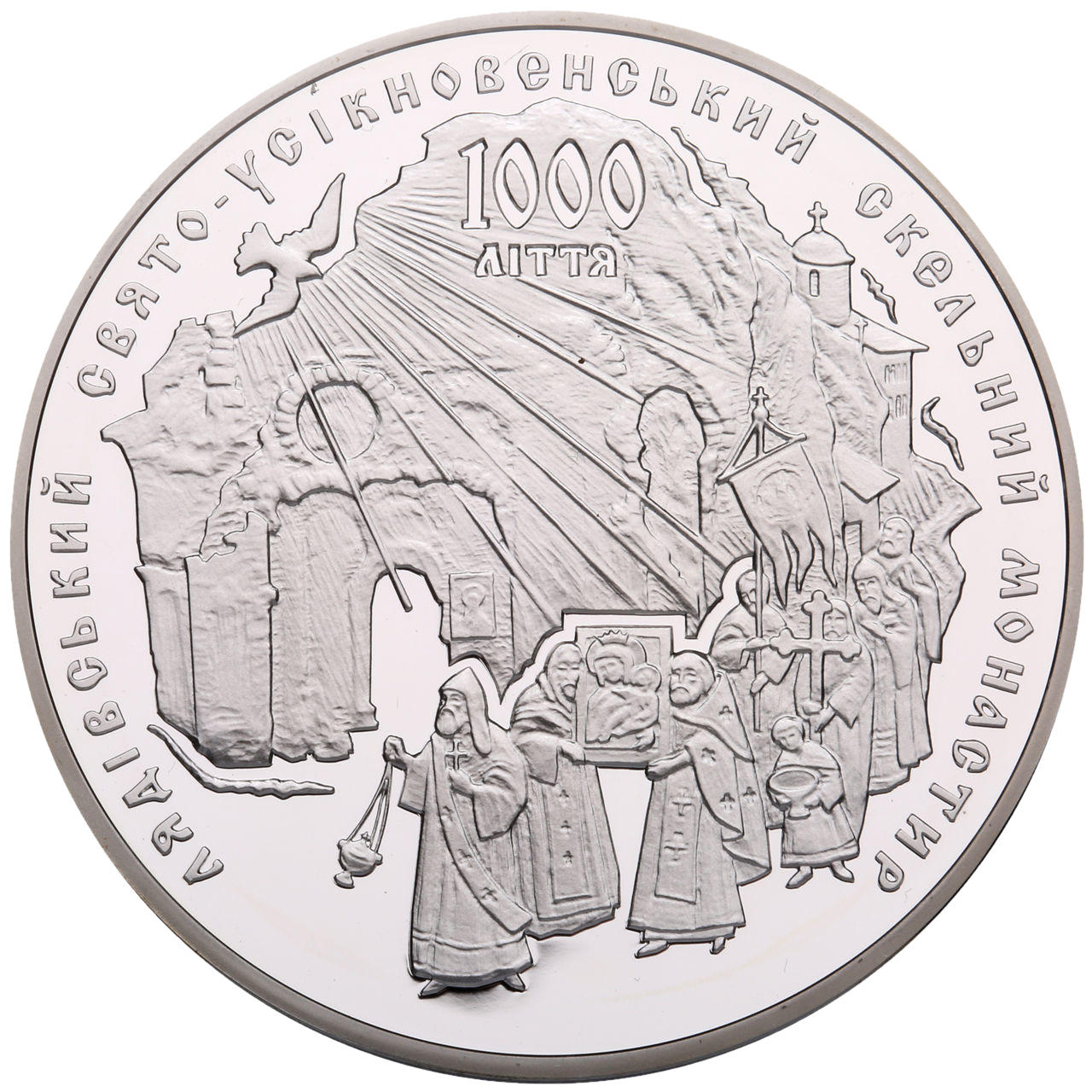 На реверсі монети зображено: стилізований фрагмент скельного монастиря, хресний хід монахів і паломників, Голуба (угорі ліворуч) і промені, що є символом Святого Духа, а також по колу написи - 1000/ЛІТТЯ (угорі) ЛЯДІВСЬКИЙ СВЯТО-УСІКНОВЕНСЬКИЙ СКЕЛЬНИЙ МОНАСТИР (по колу).