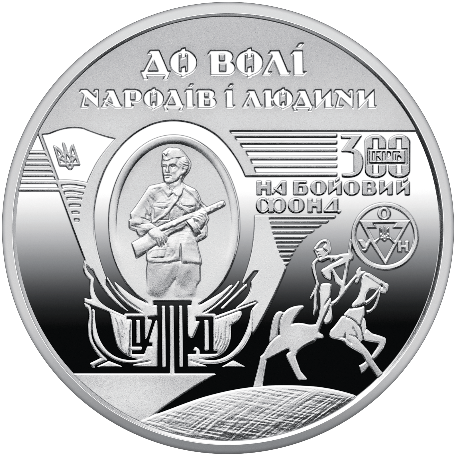 На реверсі монети зображено символічну композицію з фрагментів деревориту Ніла Хасевича, стилізовану під банкноту в дусі бофонів. Композиція містить елементи графіки митця як символу економічного, ідеологічного та морального ресурсу опору. Угорі на матовому тлі розміщено написи: ДО ВОЛІ / НАРОДІВ І ЛЮДИНИ та 300 КРБ / НА БОЙОВИЙ / ФОНД, що підкреслюють роль бофонів у зборі ресурсів для опору та співзвучні із сьогоднішньою практикою донатів.