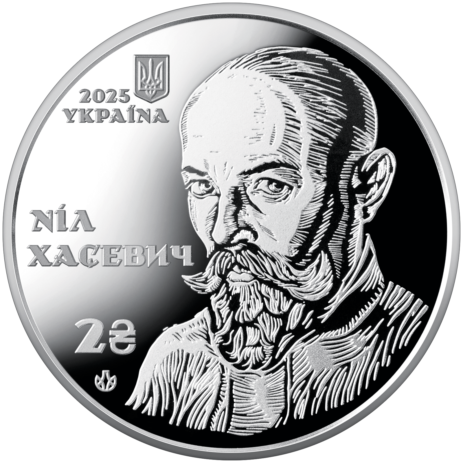 На аверсі монети в центрі композиції розміщено автопортрет Ніла Хасевича, виконаний у характерній для митця техніці деревориту, що вирізняється експресивною графікою, контрастною лінійністю та динамічним штрихуванням. Ліворуч на дзеркальному тлі зображено: малий Державний Герб України, рік карбування 2025, напис УКРАЇНА (вгорі); напис НІЛ / ХАСЕВИЧ (по центру); номінал 2 з графічним знаком гривні та логотип Банкнотно-монетного двору Національного банку України (унизу).