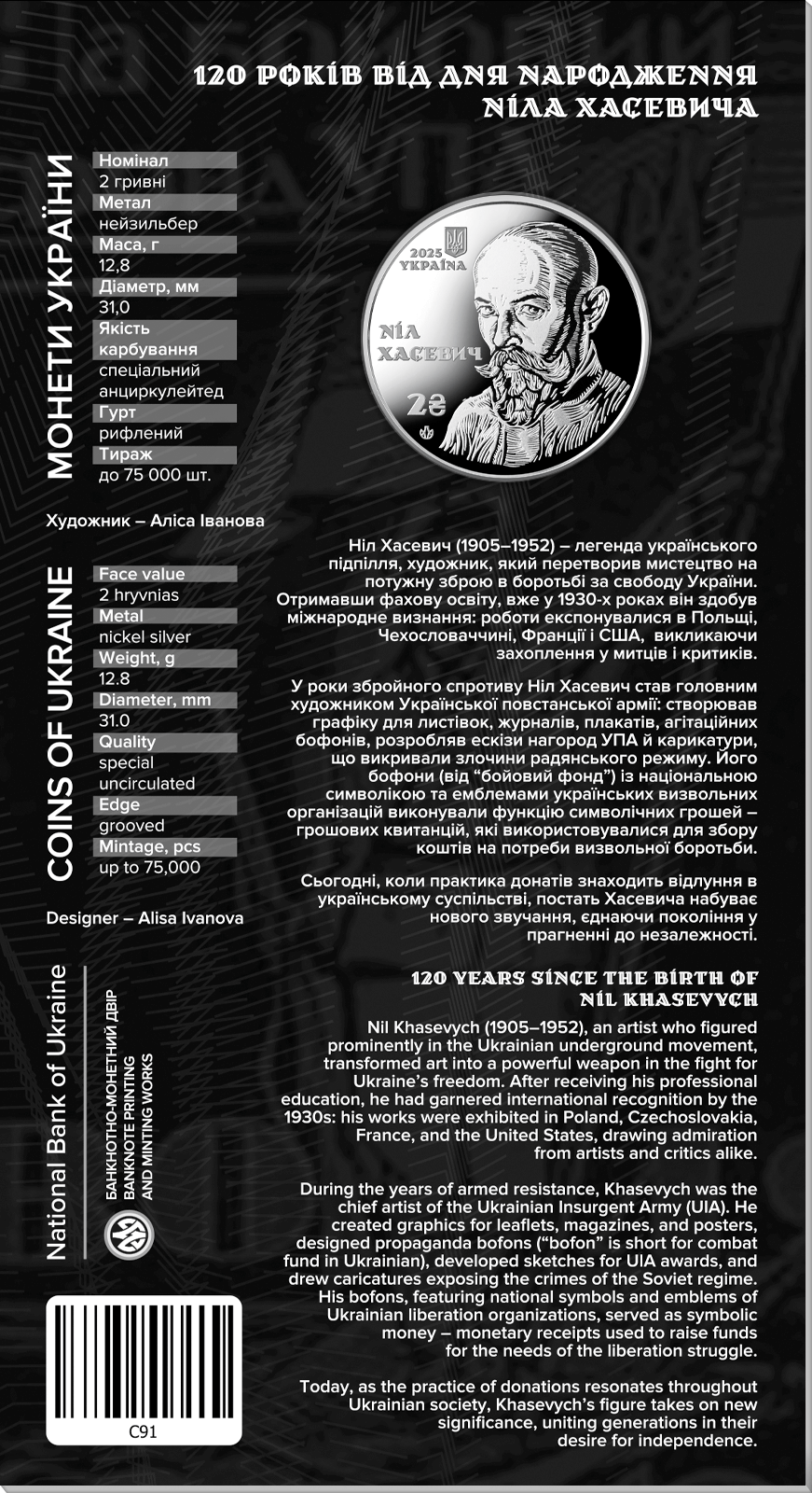 Пам’ятна монета присвячена легендарній постаті українського підпілля, видатному художнику-графіку, учаснику національно-визвольного руху, який перетворив мистецтво на потужну зброю опору.