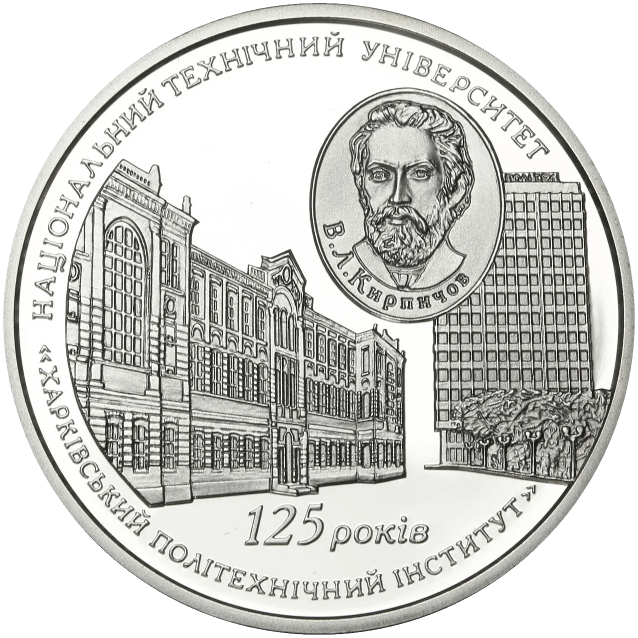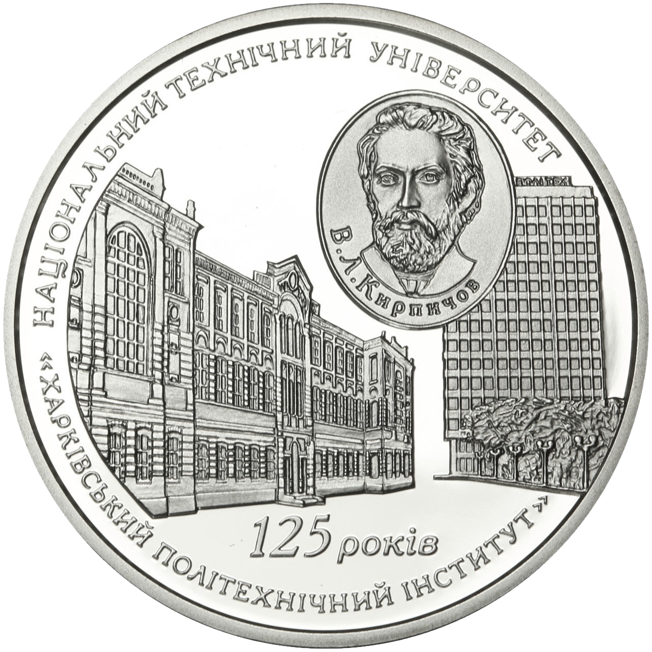 На реверсі монети зображено будівлі університету, на тлі однієї з яких портрет В.Л.Кирпичова - засновника і першого директора Харківського політехнічного інституту та розміщено написи: 125 років (унизу) і НАЦІОНАЛЬНИЙ ТЕХНІЧНИЙ УНІВЕРСИТЕТ `ХАРКІВСЬКИЙ ПОЛІТЕХНІЧНИЙ ІНСТИТУТ` (по колу).