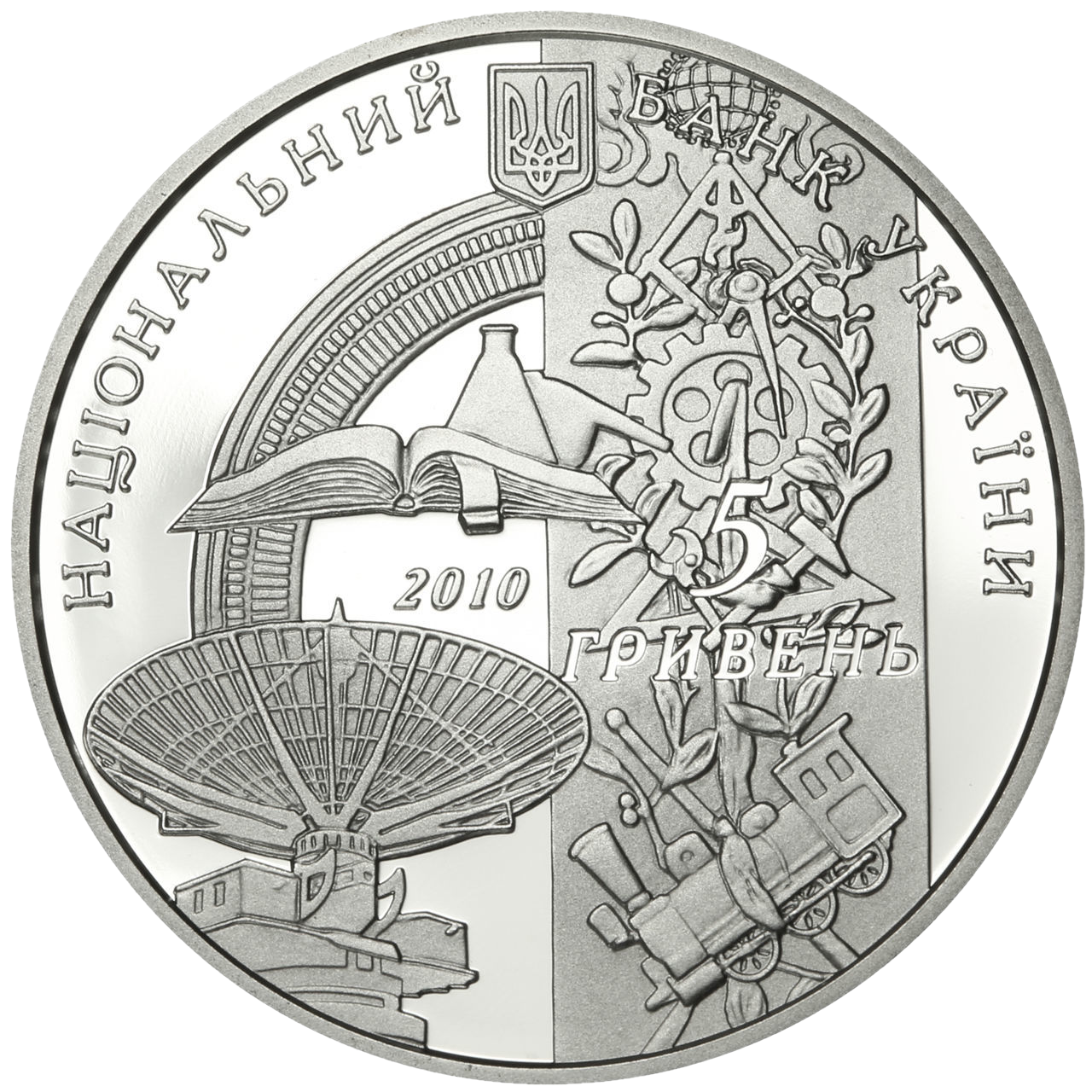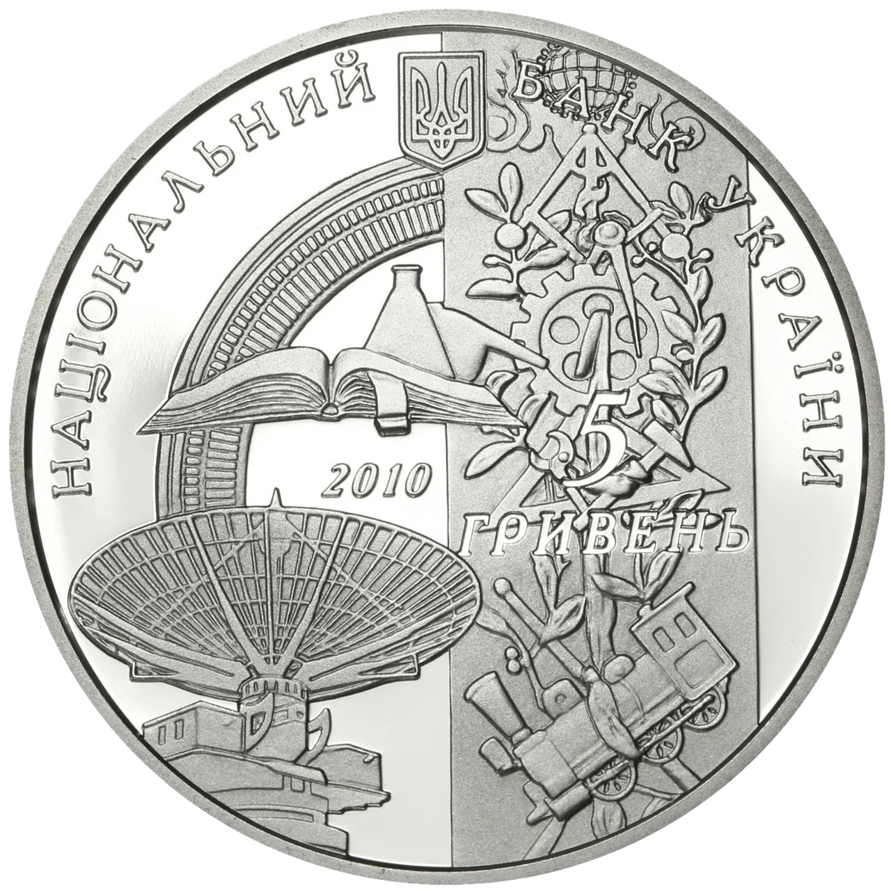 На аверсі монети розміщено малий Державний Герб України (угорі), напис півколом НАЦІОНАЛЬНИЙ БАНК УКРАЇНИ, один з рельєфів головного корпусу (праворуч), на якому зображені символи науки, на тлі якого номінал: 5/ГРИВЕНЬ; зображено гордість дослідницької бази університету - радіотелескоп (ліворуч), символ знань - книгу, під якою рік карбування монети - 2010.