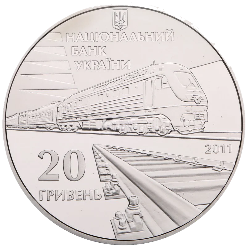 На аверсі монети розміщено: угорі малий Державний Герб України та напис НАЦІОНАЛЬНИЙ/БАНК/УКРАЇНИ, на дзеркальному тлі зображено сучасний швидкісний поїзд Української залізниці та частину колії, ліворуч - номінал 20/ГРИВЕНЬ, праворуч - рік карбування монети 2011.