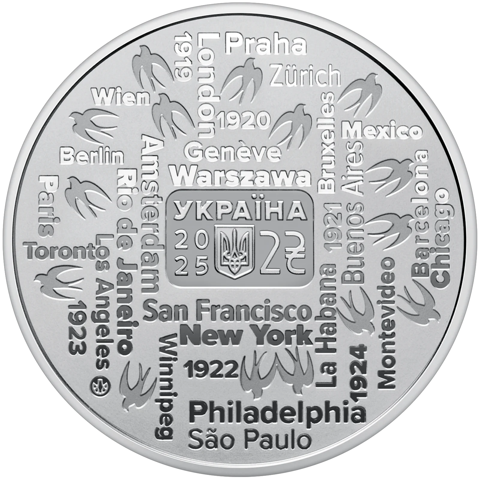 На аверсі монети розміщено композицію, що символізує гастрольну діяльність Української республіканської капели під орудою Олександра Кошиця. На матовому тлі відтворено стилізовану карту гастрольного маршруту, на якій позначено назви міст, де виступала капела. Між назвами міст зображено силуети ластівок – метафора духовного польоту, вільного руху та поширення українського мистецтва у світі. На дзеркальному тлі розміщено: напис УКРАЇНА, рік карбування 20 / 25, малий Державний Герб України, номінал 2 з графічним знаком гривні. Унизу ліворуч зазначено логотип Банкнотно-монетного двору Національного банку України.
