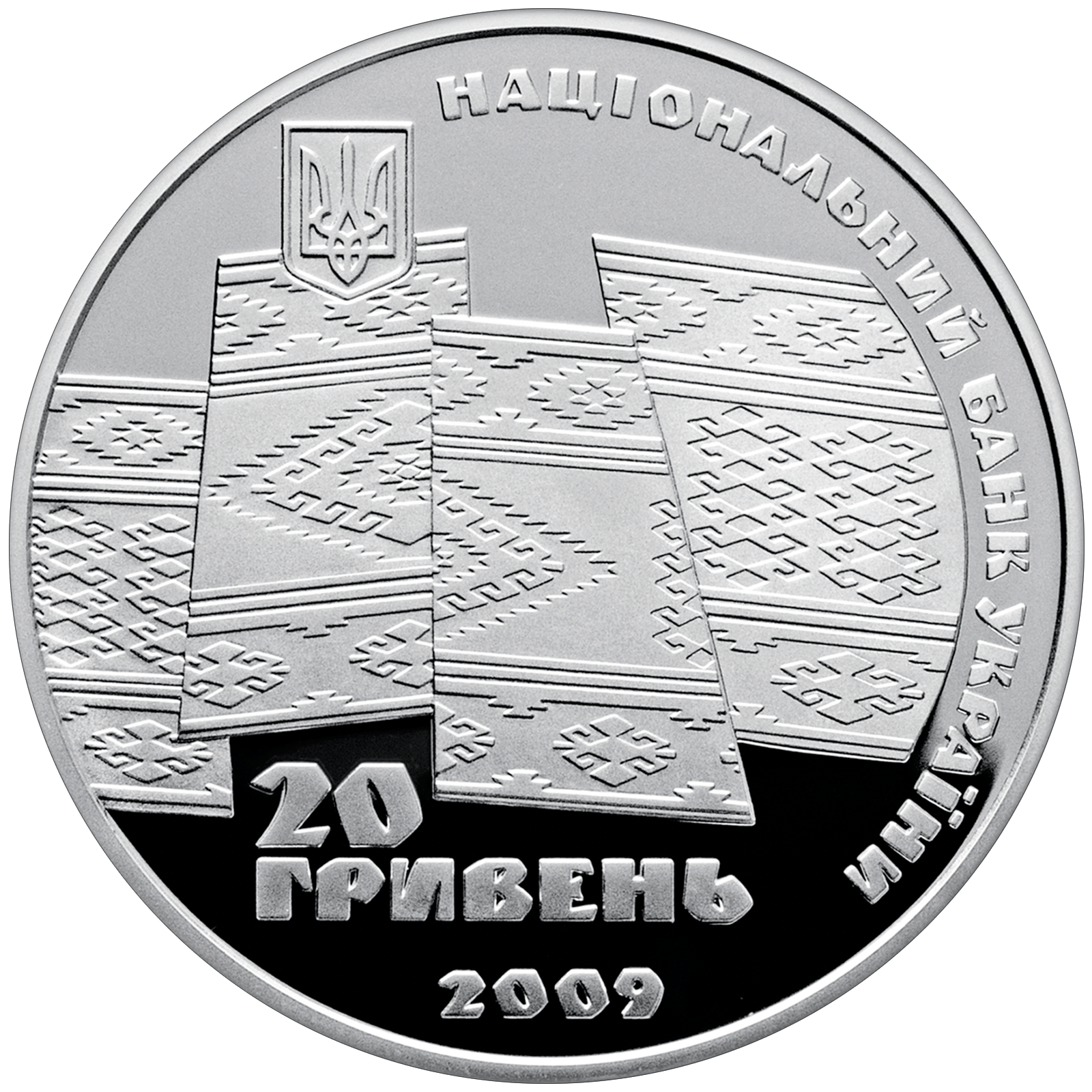 На аверсі монети зображено килими з традиційним карпатським орнаментом і розміщено: малий Державний Герб України, півколом напис - НАЦІОНАЛЬНИЙ БАНК УКРАЇНИ, унизу номінал та рік карбування монети - 20/ГРИВЕНЬ/ 2009.
