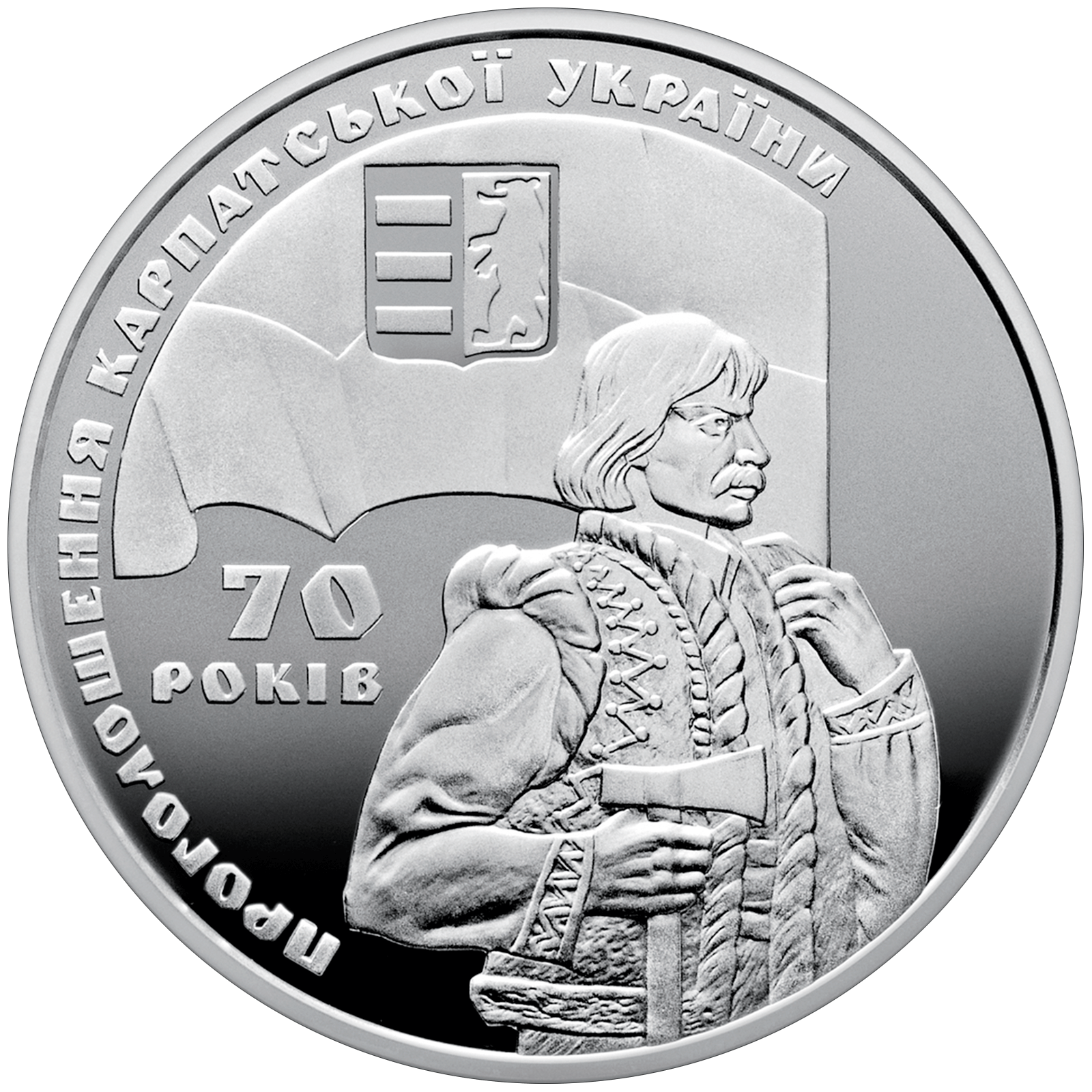 На реверсі монети зображено закарпатця з прапором, на тлі якого - герб Карпатської України, та розміщено написи: під прапором - 70/ РОКІВ, ліворуч півколом - ПРОГОЛОШЕННЯ КАРПАТСЬКОЇ УКРАЇНИ.