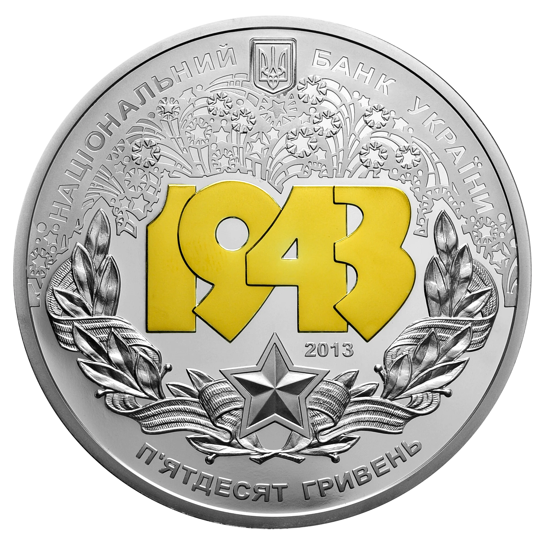 На аверсі монети розміщено: угорі малий Державний Герб України та напис півколом НАЦІОНАЛЬНИЙ БАНК УКРАЇНИ; у центрі - композицію, що символізує перемогу: цифри 1943 ( позолочені), над якими - зображення салюту, унизу - лаврова гілка зі стрічкою з ордена Слави та зіркою, праворуч над зіркою - рік карбування монети 2013; унизу напис півколом - П`ЯТДЕСЯТ ГРИВЕНЬ. Елемент оздоблення - локальна позолота, вміст золота в чистоті - не менше ніж 0,003 г.