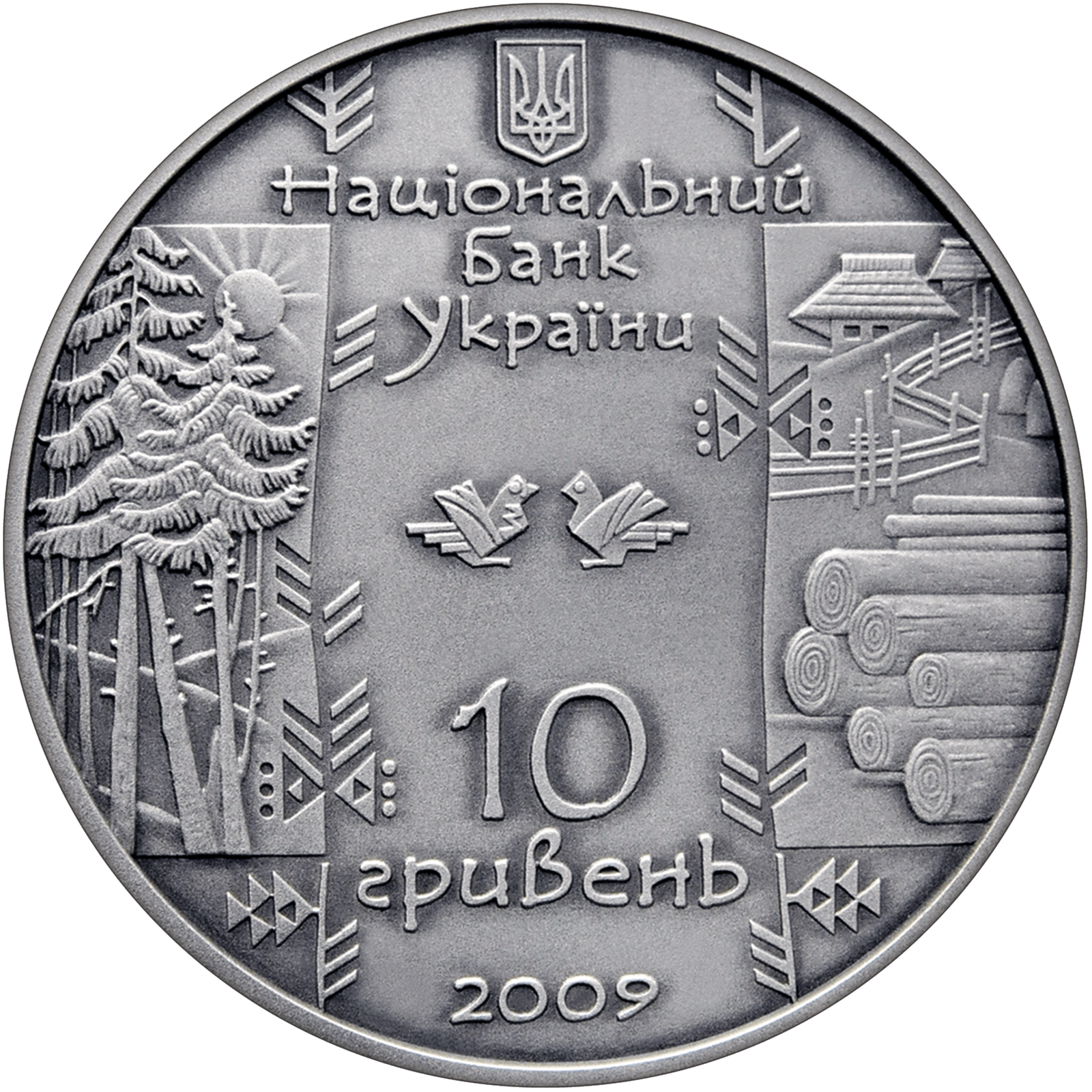 На аверсі монети угорі розміщено малий Державний Герб України, під яким стилізований напис - НАЦІОНАЛЬНИЙ/ БАНК/ УКРАЇНИ, у центрі - стилізоване зображення двох птахів, ліворуч і праворуч - карпатський пейзаж зі смереками, хатинами та колодами, унизу - напис 10/ ГРИВЕНЬ/ 2009.