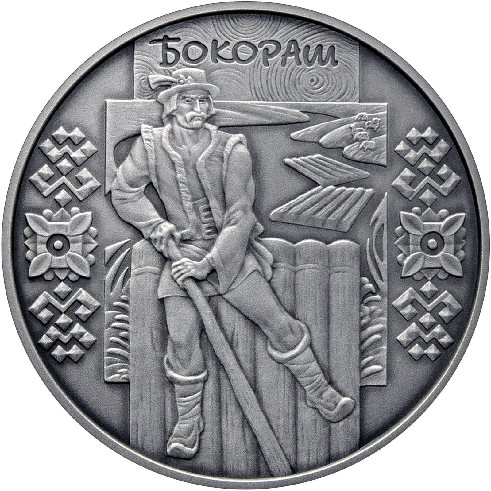 На реверсі монет зображено постать бокораша з цапиною в руках, який спрямовує пліт униз по річці, з обох боків від нього - традиційний карпатський орнамент, угорі на стилізованому під торець колод тлі розміщено напис БОКОРАШ.