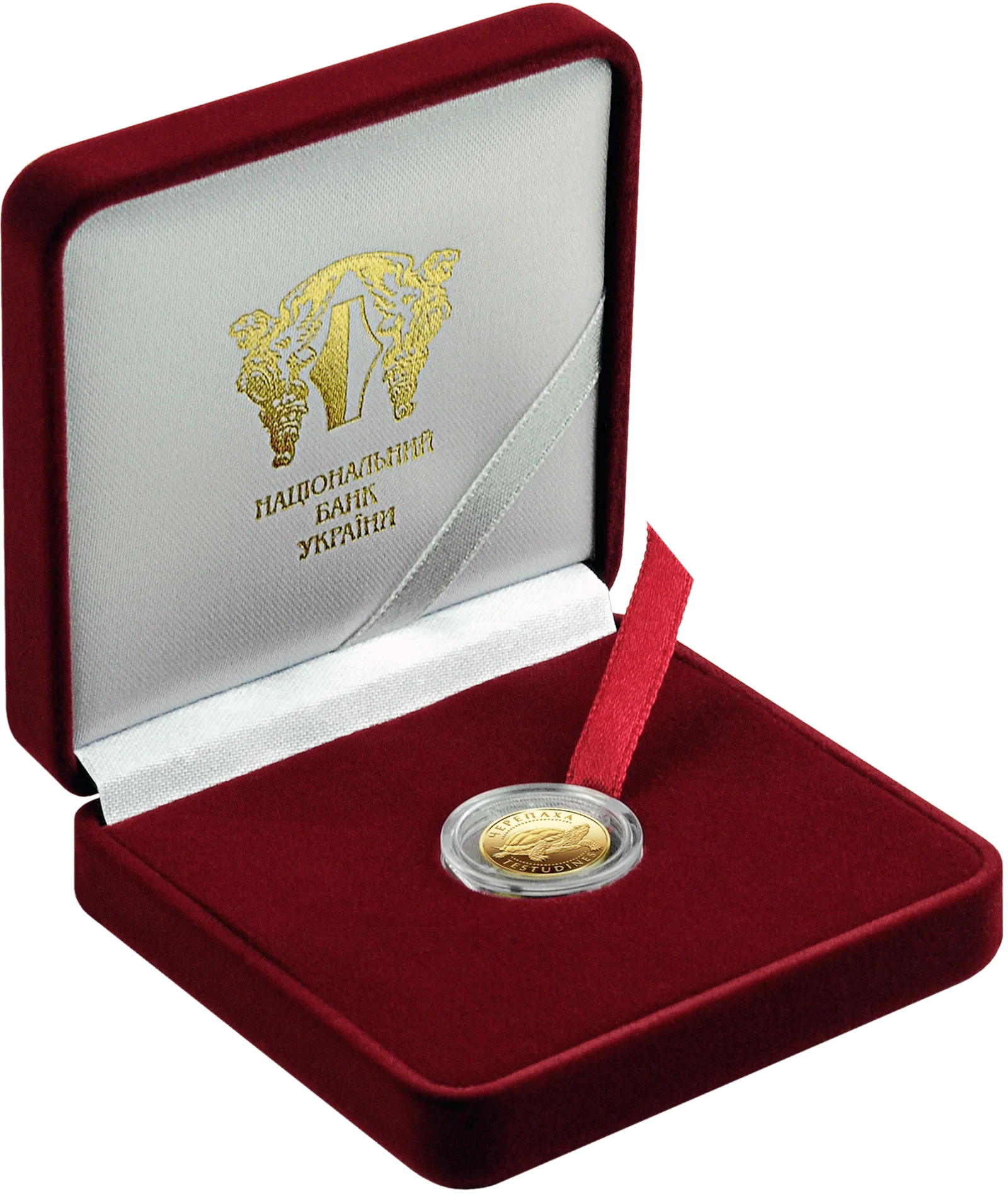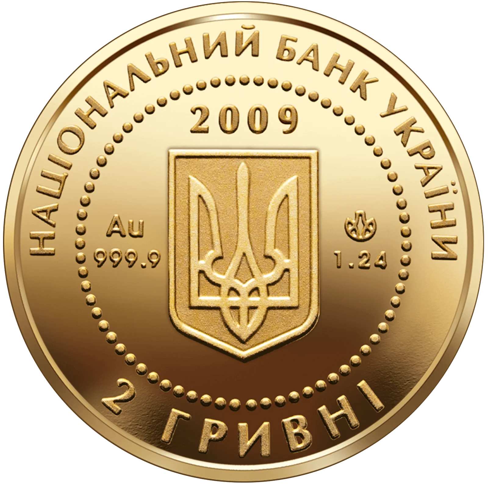На аверсі монети в намистовому колі розміщено малий Державний Герб України, над яким - рік карбування монети - 2009; між намистовим колом і кантом монети - кругові написи: УКРАЇНА (угорі), 2 ГРИВНІ (унизу), а також позначення металу, його проби - Au 999,9 (ліворуч), маса - 1,24 та логотип Монетного двору Національного банку України (праворуч).