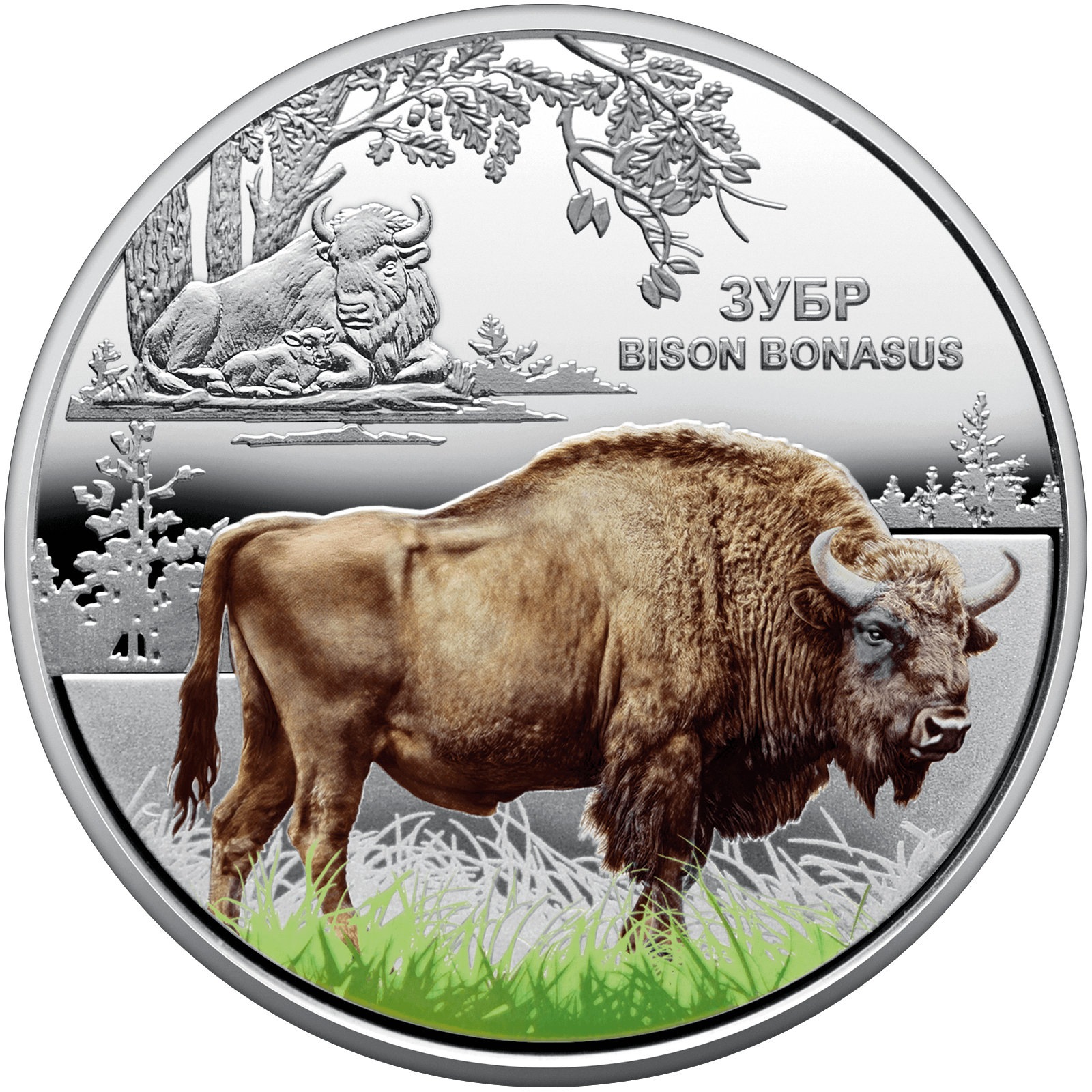 На реверсі монети на тлі пейзажу зображено зубра (кольоровий друк), над яким праворуч на дзеркальному тлі написи: ЗУБР / BISON BONASUS; угорі ліворуч – зубр із зубреням.