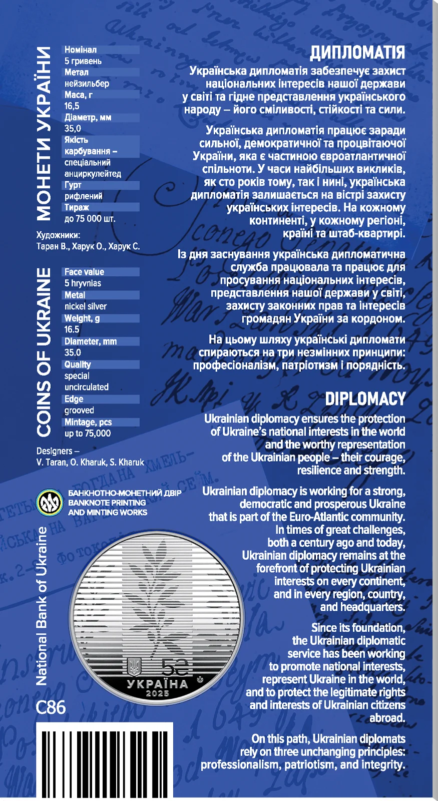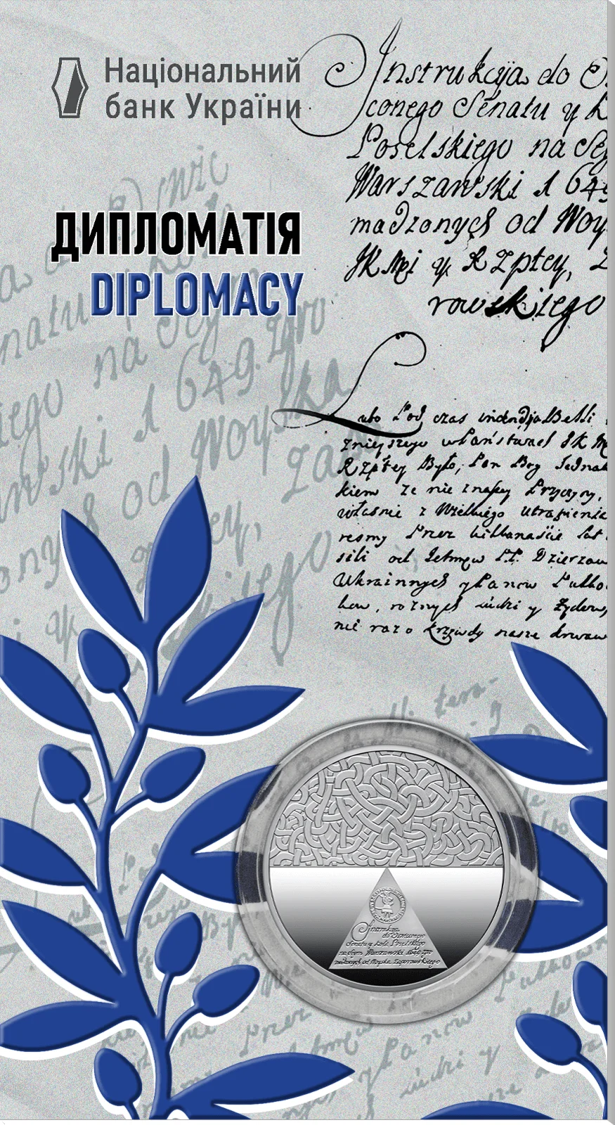 Пам’ятна монета присвячена дипломатії – одній із форм реалізації державних інтересів та зовнішньополітичної позиції держави шляхом діалогу, переговорів і забезпечення відповідального балансу між державницькими принципами та політичними обставинами. Дипломатія є невід’ємною складовою процесу державотворення, що забезпечує позиціонування України в загальній системі міжнародних відносин, сприяє утвердженню її суверенітету, безпеки та міжнародної суб’єктності. Українська дипломатична традиція формувалася впродовж століть – від козацьких посольств і гетьманських універсалів до сучасної багатовекторної дипломатії незалежної держави, ґрунтуючись на тяглості політичної думки, відповідальності за державні рішення та здатності до стратегічної рівноваги.