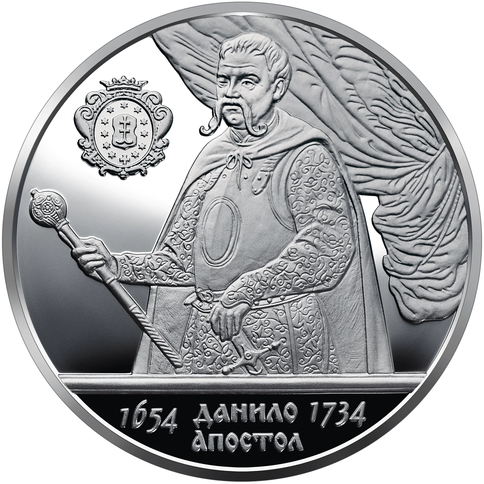 На реверсі монети зображено портрет Данила Апостола на тлі драпування, ліворуч - його герб, унизу напис у два рядки ДАНИЛО АПОСТОЛ, ліворуч і праворуч від якого роки життя 1654 - 1734.