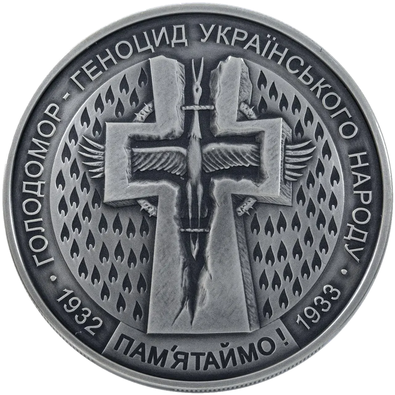 На реверсі монети на тлі запалених свічок зображено хрест з лелекою всередині та по колу розміщено написи: ГОЛОДОМОР - ГЕНОЦИД УКРАЇНСЬКОГО НАРОДУ, 1932 ПАМ`ЯТАЙМО! 1933.