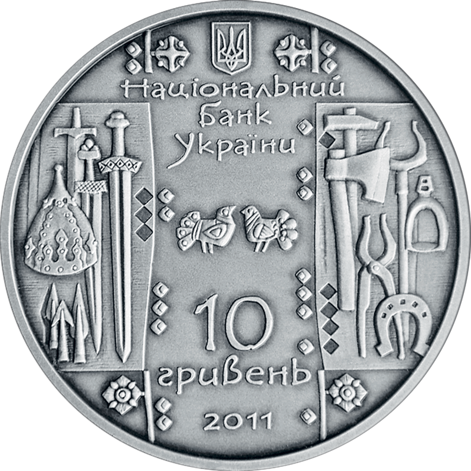 На аверсі монети розміщено: угорі малий Державний Герб України, під яким стилізований напис - НАЦІОНАЛЬНИЙ/БАНК/УКРАЇНИ, у центрі - стилізоване зображення двох пташок, ліворуч і праворуч від яких вироби коваля - давньоруська зброя та предмети побуту, унизу написи: 10/ ГРИВЕНЬ/2011.