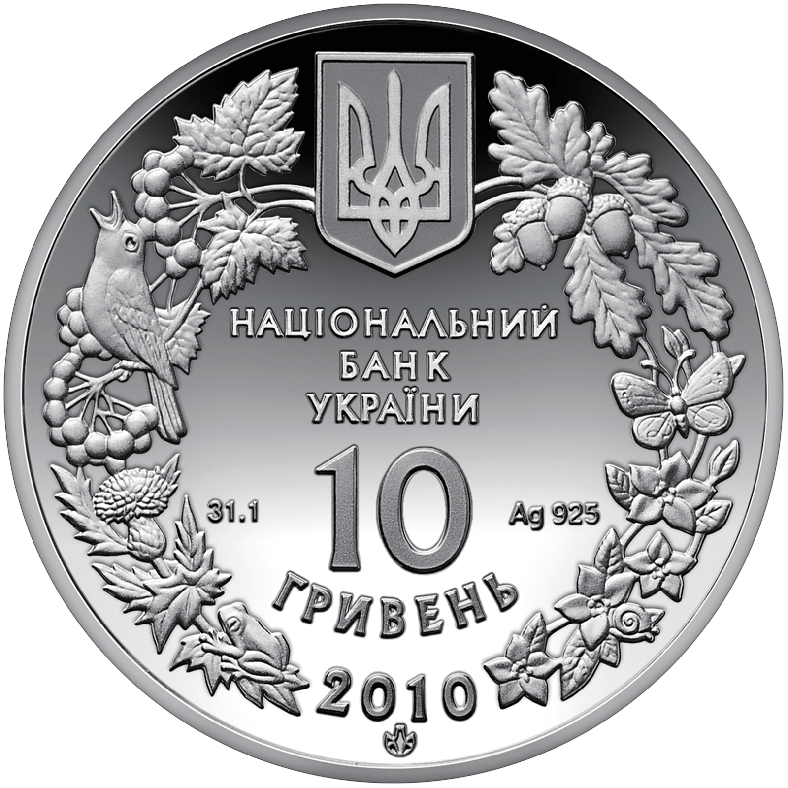 На аверсі монети в обрамленні вінка, утвореного із зображень окремих видів флори і фауни, розміщено малий Державний Герб України та написи: на монеті зі срібла - НАЦІОНАЛЬНИЙ/ БАНК/ УКРАЇНИ/ 10/ ГРИВЕНЬ/ 2010, а також позначення металу та його проби - Ag 925, маса в чистоті - 31,1, логотип Монетного двору Національного банку України.