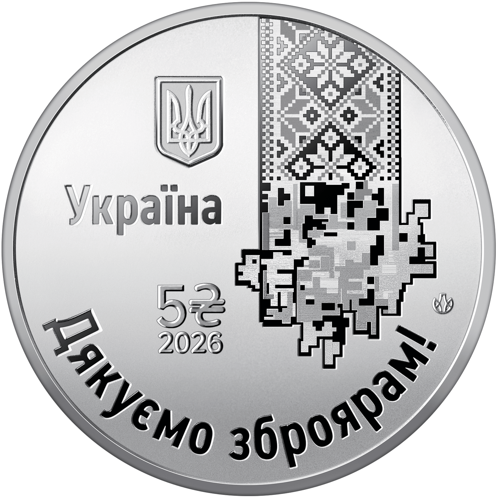 сили – від спадщини минулого до інновацій сьогодення. У верхній частині композиції ліворуч зазначено: малий Державний Герб України, напис УКРАЇНА, номінал 5 та графічний знак гривні, рік карбування монети – 2026. Праворуч розміщено логотип Банкнотно-монетного двору Національного банку України. Унизу монети – напис ДЯКУЄМО ЗБРОЯРАМ!.