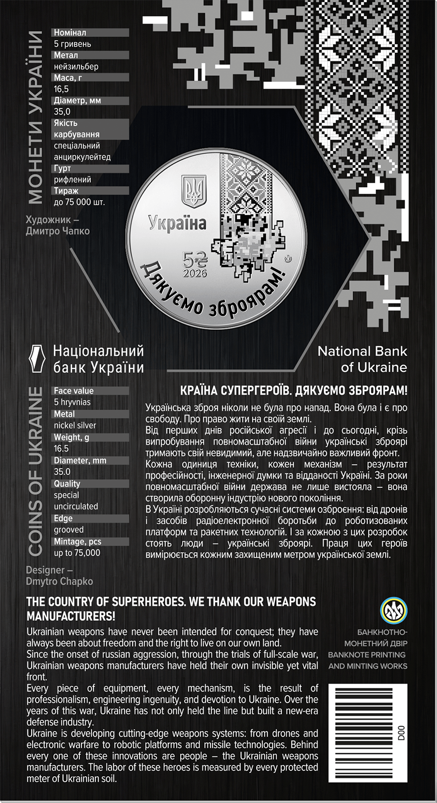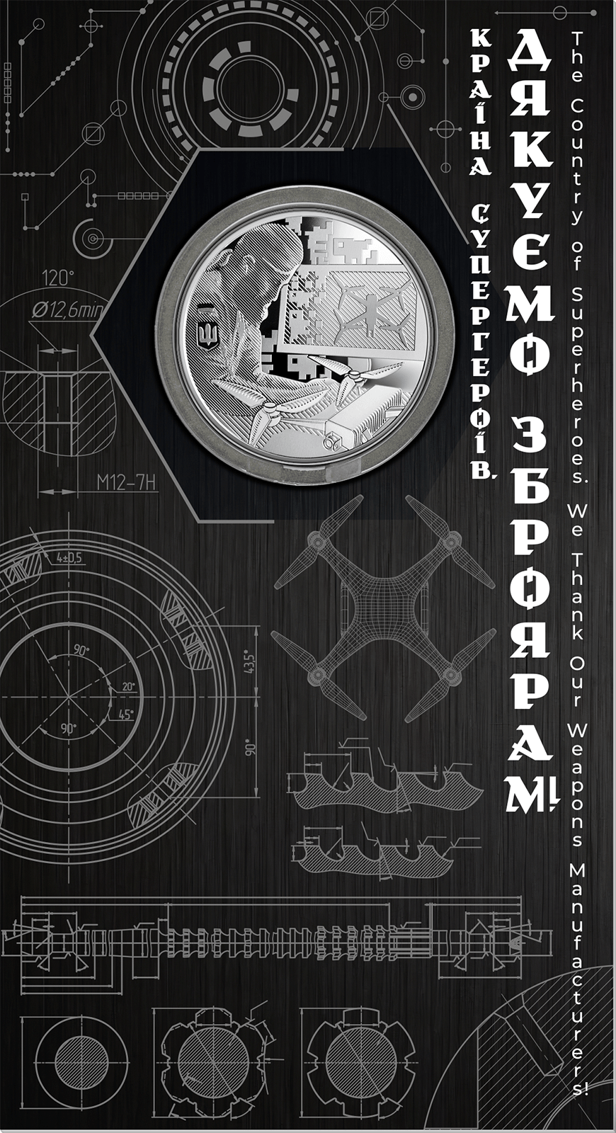 Пам’ятна монета присвячена тим, хто зміцнює обороноздатність України. Завдяки впровадженню інноваційних підходів і нестандартних рішень наші зброярі створюють новітні системи озброєння, які захищають українську землю в російсько-українській війні та визначають світові тенденції у військовій промисловості.
