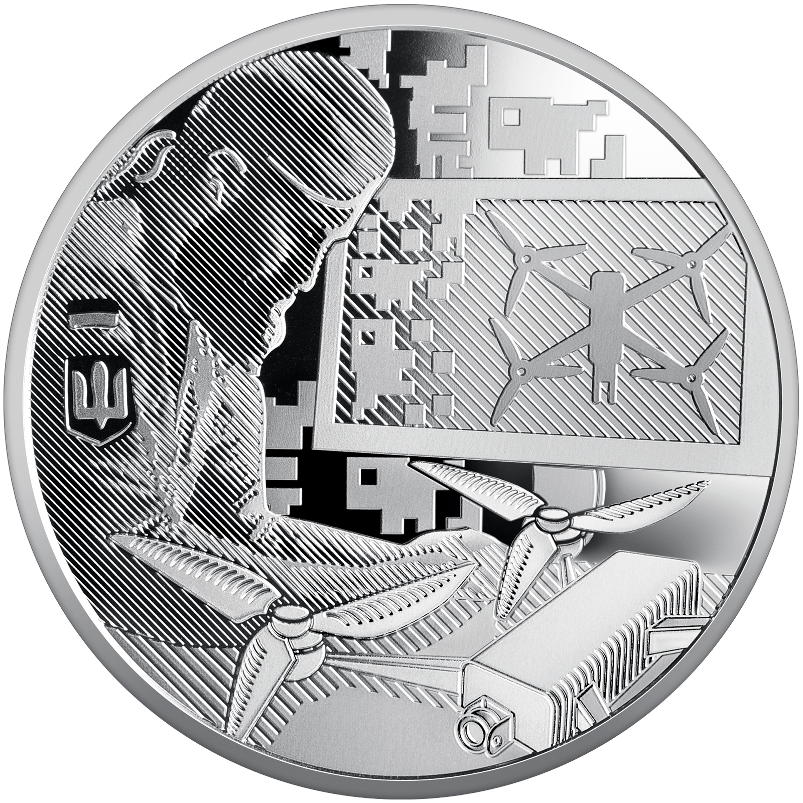 На реверсі монети зображено постать українського зброяра, зосередженого на створенні одного з найефективніших на сьогодні видів озброєння – БпЛА. Це збірний образ українських інженерів, конструкторів та інших технічних спеціалістів, чиї знання, ідеї та інновації перетворюються на інструменти захисту держави. Їхня робота не щодня потрапляє до фронтових хронік, але суттєво впливає на перебіг війни.
