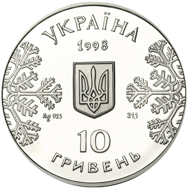 На аверсі монети в центрі зображено малий Державний герб України, по боках якого розміщені фрагменти зображення сніжинок і позначення і проба дорогоцінного металу Аg 925 та його вага у чистоті 31,1. Над гербом цифри 1998 - дата карбування монети. По колу написи: вгорі УКРАЇНА та внизу у два рядки 10 ГРИВЕНЬ