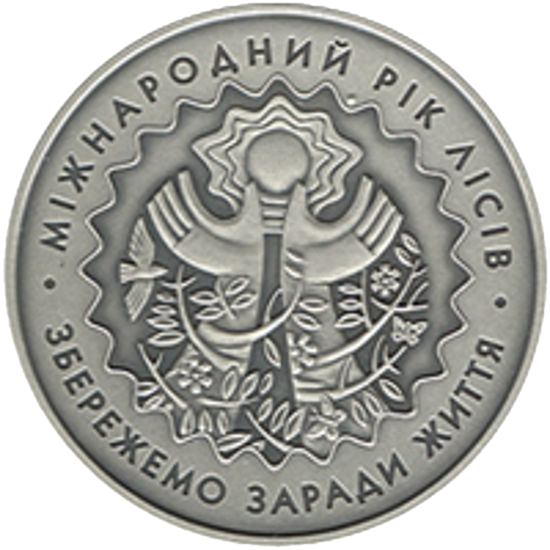 На реверсі монети зображено руки-гілки, що тягнуться до сонця, по колу розміщено написи: МІЖНАРОДНИЙ РІК ЛІСІВ (угорі), ЗБЕРЕЖЕМО ЗАРАДИ ЖИТТЯ (унизу).