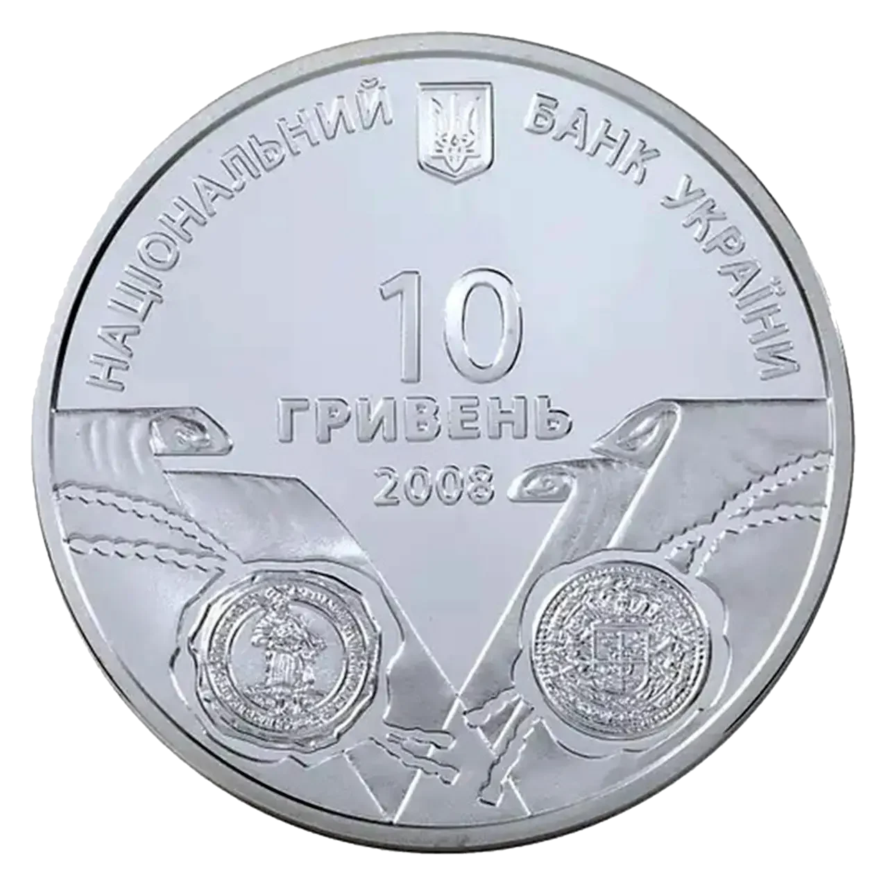 На аверсі монети вгорі розміщено напис півколом НАЦІОНАЛЬНИЙ БАНК УКРАЇНИ, малий Державний Герб України, під яким номінал монети та рік карбування - 10/ ГРИВЕНЬ/2008, стилізоване зображення сувоїв з печатками, що символізують українсько-шведські воєнно-політичні союзи.