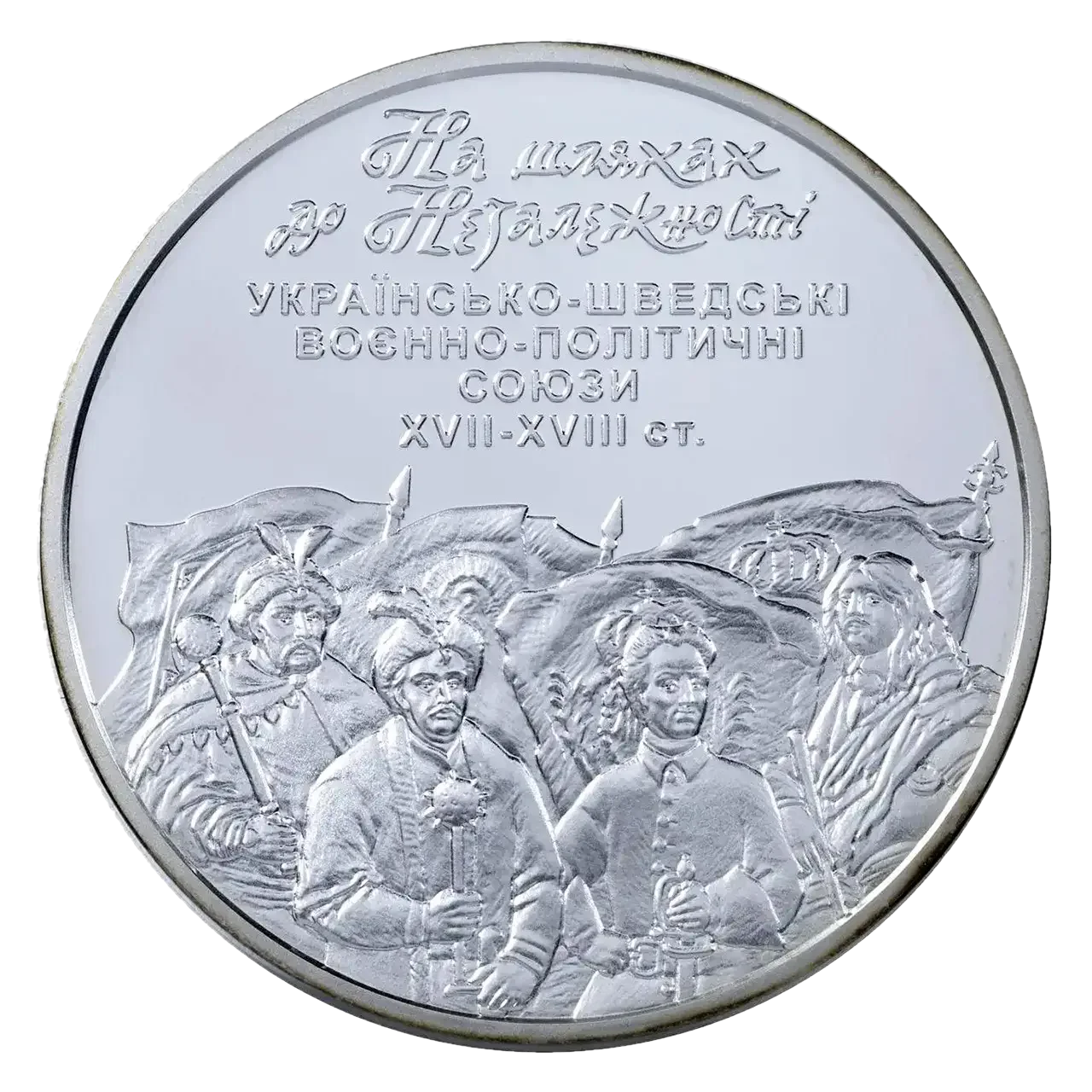 На реверсі монети на тлі прапорів зображено портретний ряд - гетьмани Богдан Хмельницький та Іван Мазепа, королі Карл XІІ та Карл X Густав (зліва направо) - найбільш знакові персони відповідного історичного періоду.
