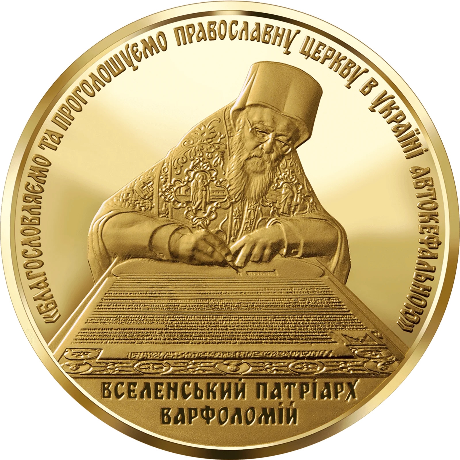 На реверсі монети на дзеркальному тлі зображено Вселенського Патріарха Варфоломія, який підписує Томос; розміщено написи: «БЛАГОСЛОВЛЯЄМО ТА ПРОГОЛОШУЄМО ПРАВОСЛАВНУ ЦЕРКВУ В УКРАЇНІ АВТОКЕФАЛЬНОЮ» (півколом угорі) та ВСЕЛЕНСЬКИЙ ПАТРІАРХ/ВАРФОЛОМІЙ (унизу).