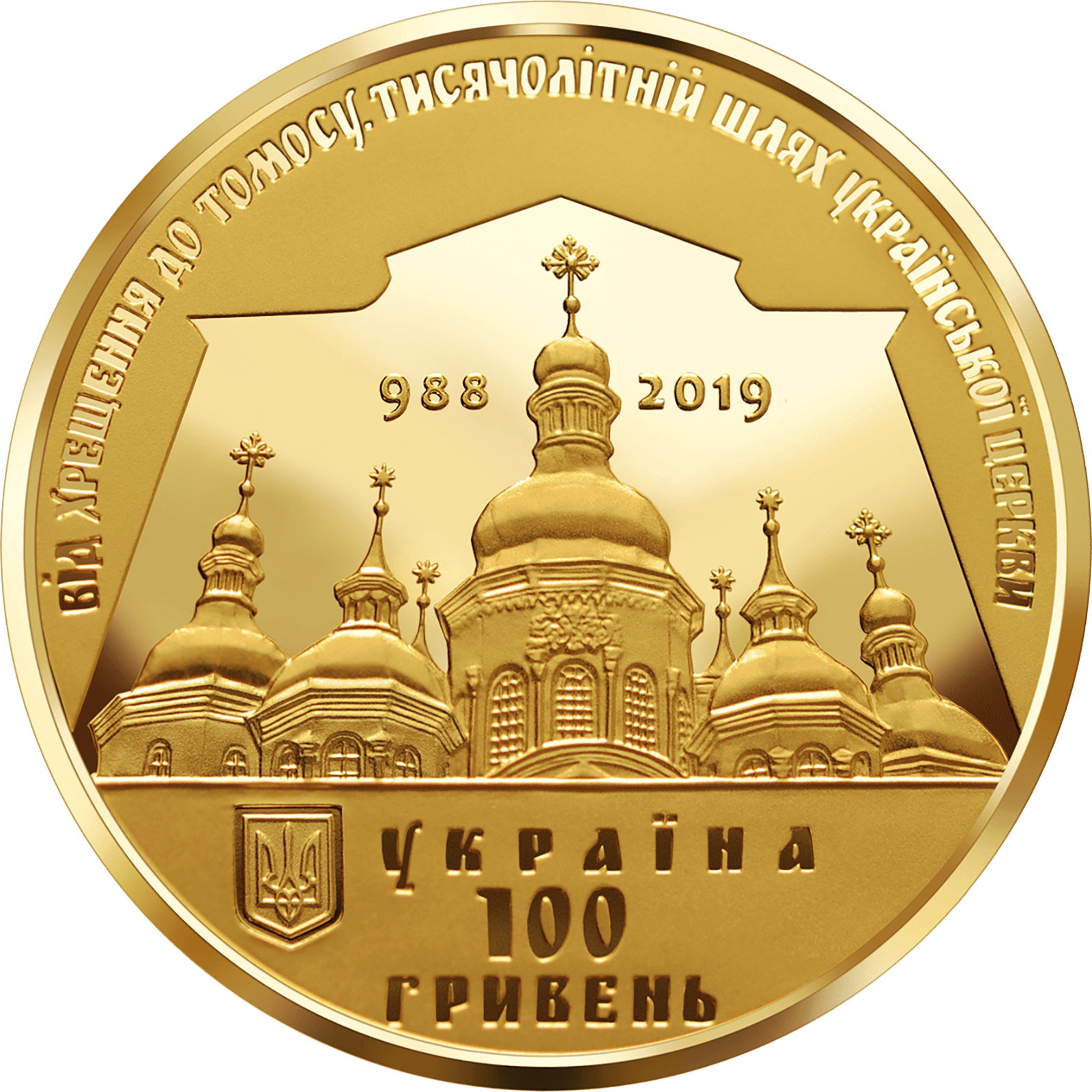 На аверсі монети розміщено: угорі півколом напис: ВІД ХРЕЩЕННЯ ДО ТОМОСУ. ТИСЯЧОЛІТНІЙ ШЛЯХ УКРАЇНСЬКОЇ ЦЕРКВИ; внизу: малий Державний Герб України та написи УКРАЇНА/100/ГРИВЕНЬ; у центрі на дзеркальному тлі абрису собору Святого Георгія у Стамбулі – бані Софійського собору в Києві, по обидва боки від центрального куполу – роки 988 та 2019.