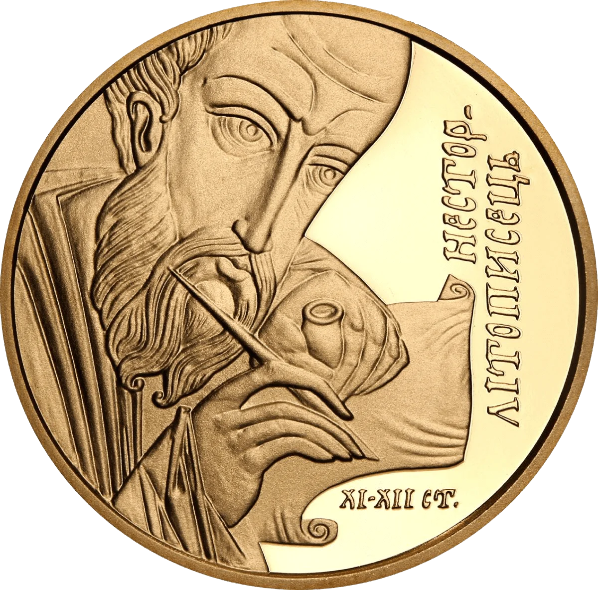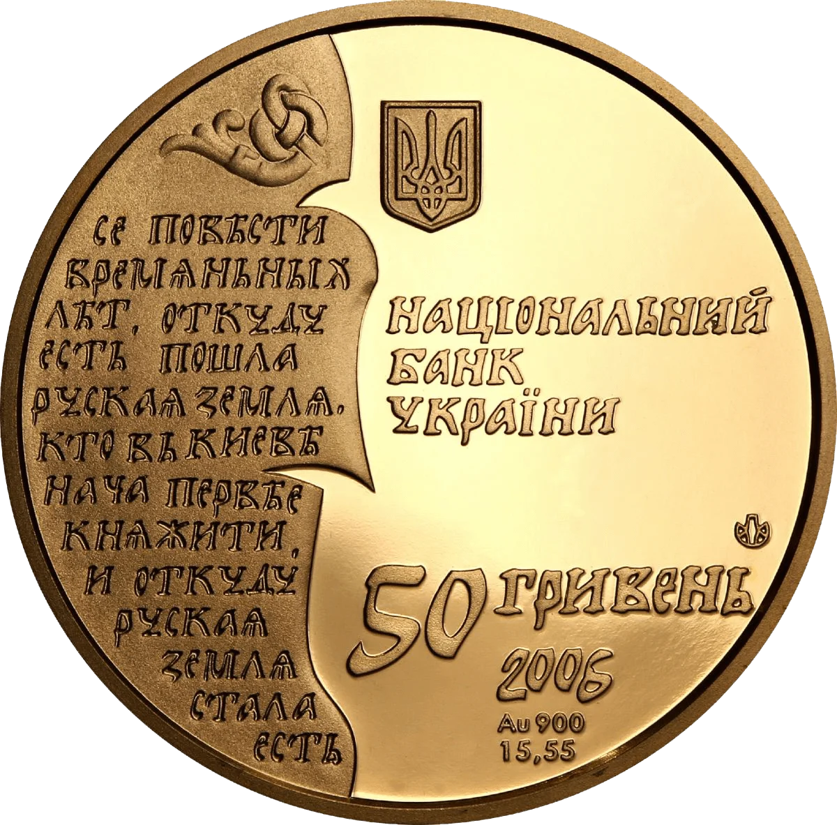 На аверсі монети зображено стилізований фрагмент (ліворуч) аркуша `Повісті временних літ` з початковими її рядками та розміщено: у центрі монети угорі - малий Державний Герб України, під яким у три рядки напис - НАЦІОНАЛЬНИЙ БАНК УКРАЇНИ, унизу номінал - 50 ГРИВЕНЬ, рік карбування монети - 2006, позначення металу, його проби - Au 900, маса в чистоті - 15,55 та логотип Монетного двору Національного банку України.
