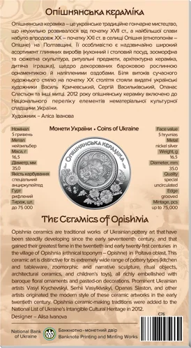 Пам’ятна монета присвячена традиційному гончарному мистецтву, що сформувалося в селищі Опішня на Полтавщині і бере свій початок ще з XVII століття. Опішнянська кераміка стала знаковим явищем національної культури – як у мистецькому, так і в етнографічному вимірах. Вона поєднує глибоку художню самобутність і витончену техніку виконання, які протягом століть зберігаються та передаються від покоління до покоління. У 2012 році опішнянська кераміка була внесена до Національного переліку елементів нематеріальної культурної спадщини України, що засвідчує її значущість як складової культурної ідентичності.
