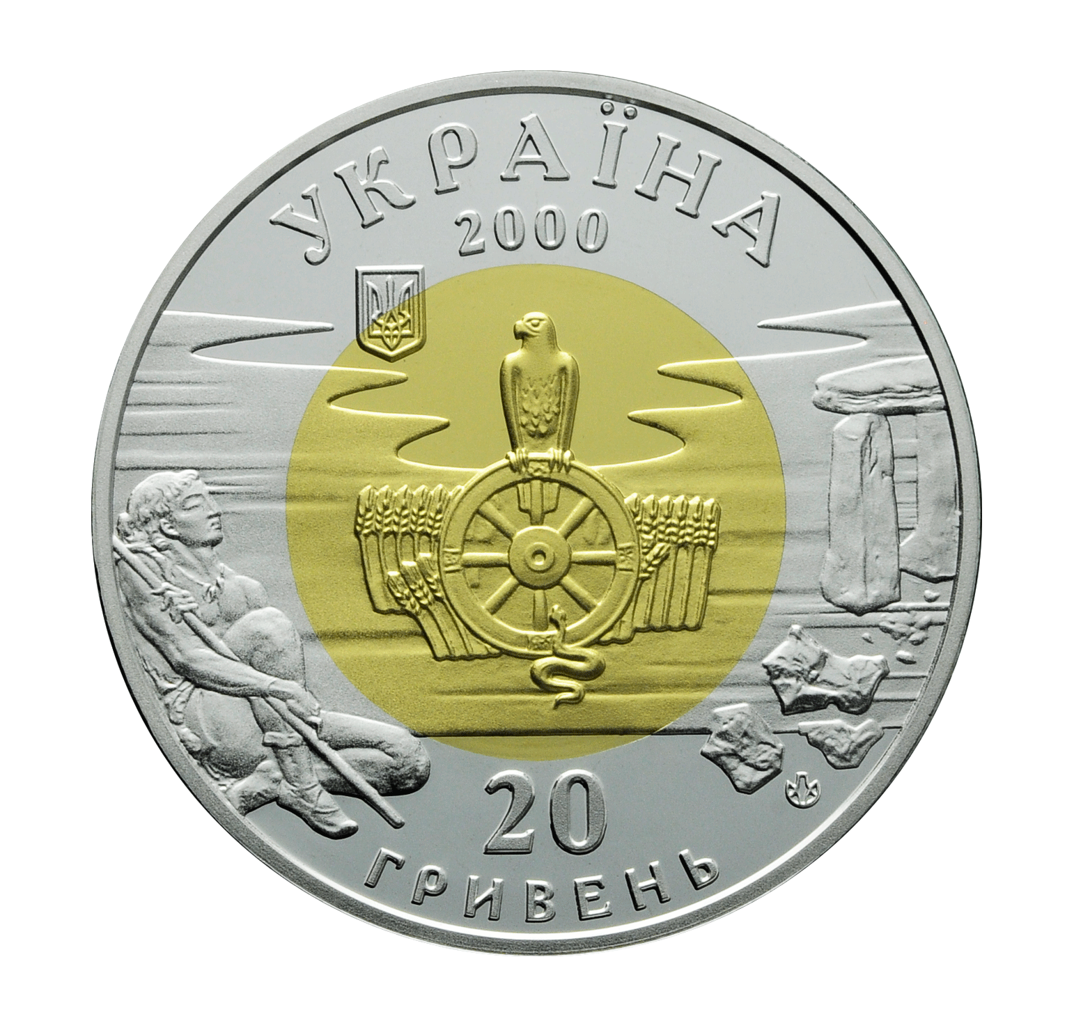 На аверсі монети у внутрішньому колі в центрі на тлі житнього колосся зображено символічне колесо історії, на якому сидить сокіл, а внизу – змія, угорі ліворуч розміщено малий Державний Герб України; у зовнішньому колі розміщено зображення людини – ліворуч та кам`яної споруди – праворуч, логотип Монетного двору і написи: УКРАЇНА / 2000 / 20 / ГРИВЕНЬ/.