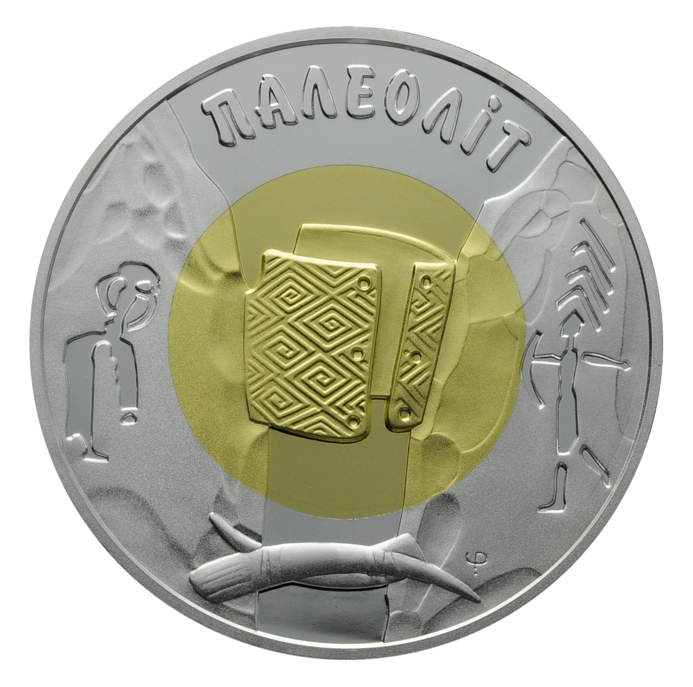 На реверсі монети у внутрішньому колі зображено різьблений мізинський браслет із бивнів мамонта; у зовнішньому колі – наскельні малюнки первісних людей, бивні мамонта та стилізований напис: ПАЛЕОЛІТ