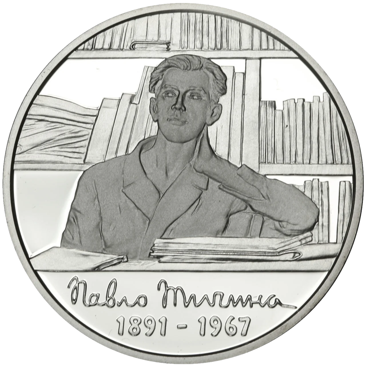 На реверсі монети зображено портрет Павла Тичини на тлі книжкових полиць, унизу - стилізований напис Павло Тичина та роки життя 1891 - 1967.