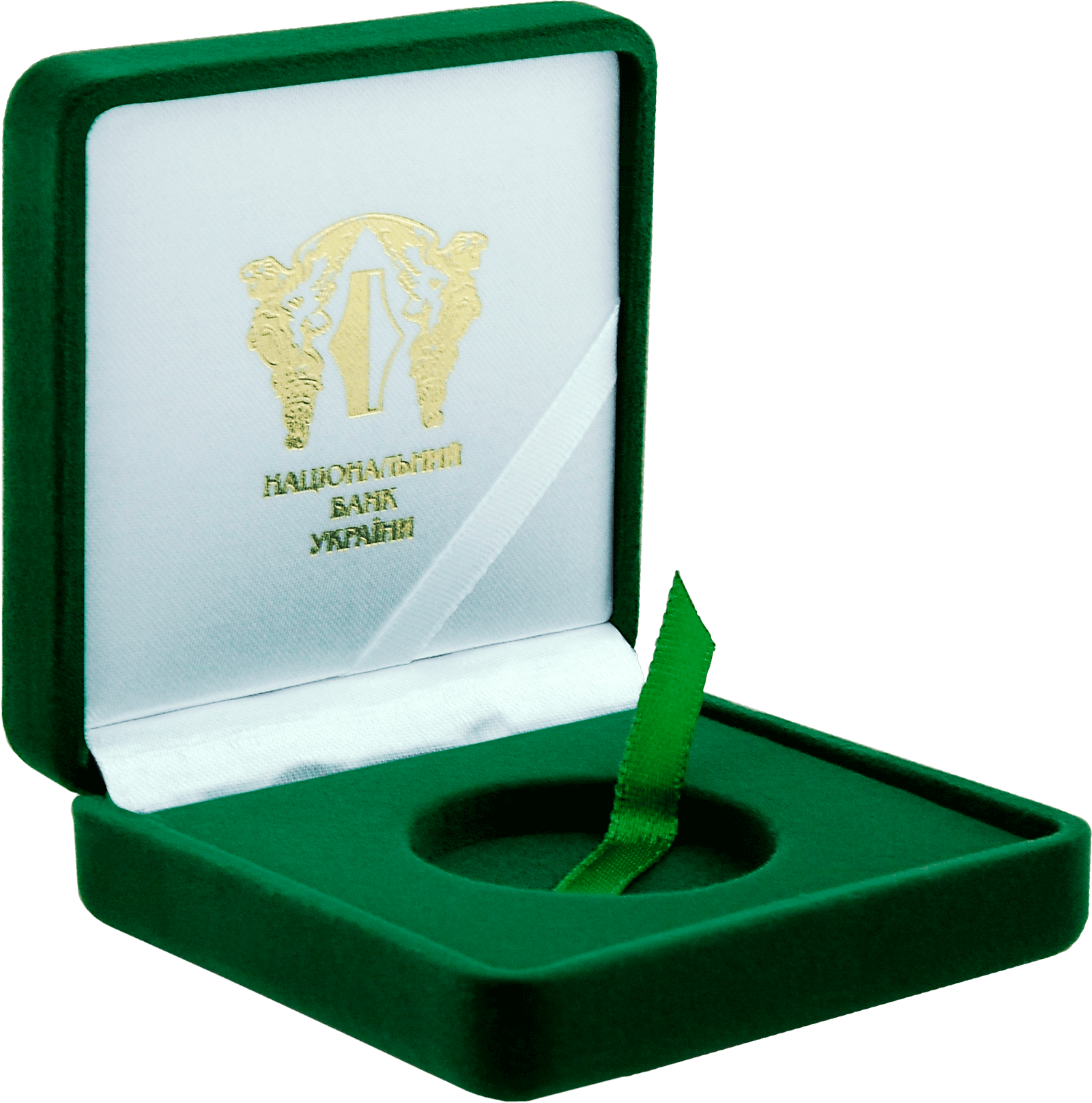 Подарунковий футляр із флоку. Габаритні розміри: 75х75х24 мм. Призначається для вкладення однієї монети діаметром 25,0 мм (зовнішній діаметр капсули, у яку вкладається монета – 33 мм). Ложемент футляра має отвір глибиною 5,5 мм та стрічку для зручного виймання капсули з монетою. На внутрішній поверхні кришки футляра, обтягнутої білою атласною тканиною, нанесено логотип Національного банку України. Усі матеріали, використані для виготовлення футляра, не містять шкідливих речовин, що негативно впливають на стан поверхонь монет із дорогоцінних та недорогоцінних металів”