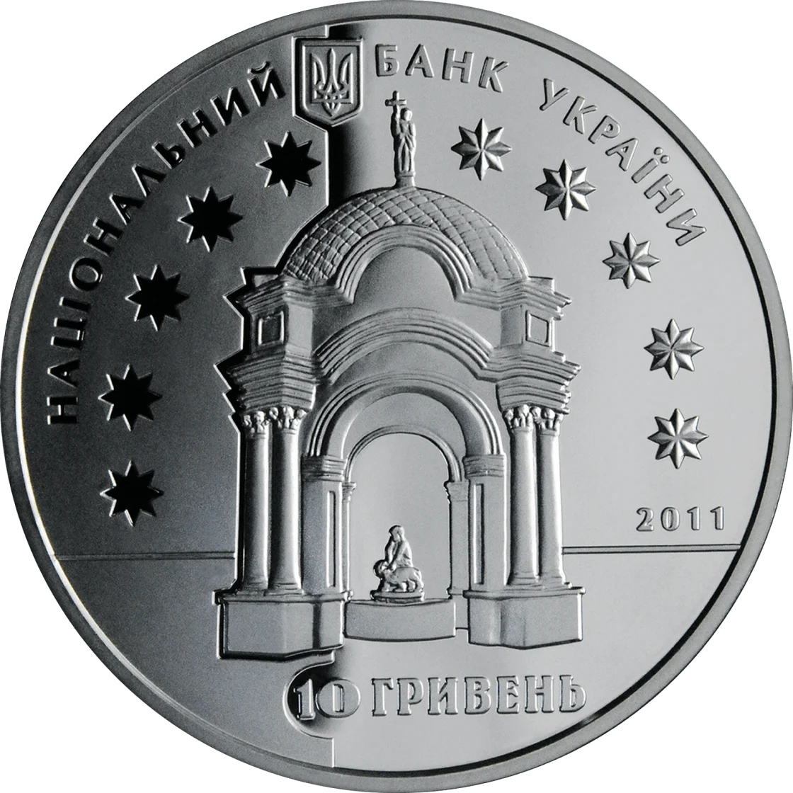 На аверсі монети вгорі розміщено: малий Державний Герб України, напис півколом НАЦІОНАЛЬНИЙ БАНК УКРАЇНИ, унизу номінал - 10 ГРИВЕНЬ, фонтан `Самсон`, що на Подолі в місті Києві, в обрамленні восьмикутних зірок, які часто використовував Іван Григорович-Барський в архітектурному оздобленні (стиль бароко); праворуч - рік карбування монети 2011.