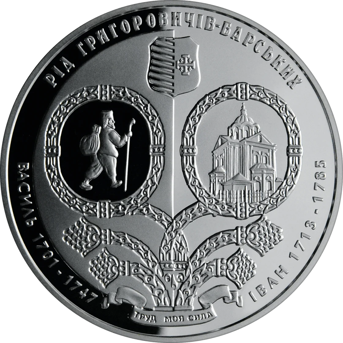 На реверсі монети зображено герб роду Григоровичів-Барських, стилізоване генеалогічне дерево, у картушах якого представлено малюнок мандрівника Василя Григоровича-Барського (ліворуч), на якому він зобразив себе, та церкву Миколи Набережного в Києві (праворуч), збудовану за проектом архітектора Івана Григоровича-Барського; по колу розміщено написи: РІД ГРИГОРОВИЧІВ-БАРСЬКИХ (угорі), ВАСИЛЬ 1701 - 1747 (ліворуч), ІВАН 1713 - 1785 (праворуч), девіз роду ТРУД МОЯ СИЛА (унизу).