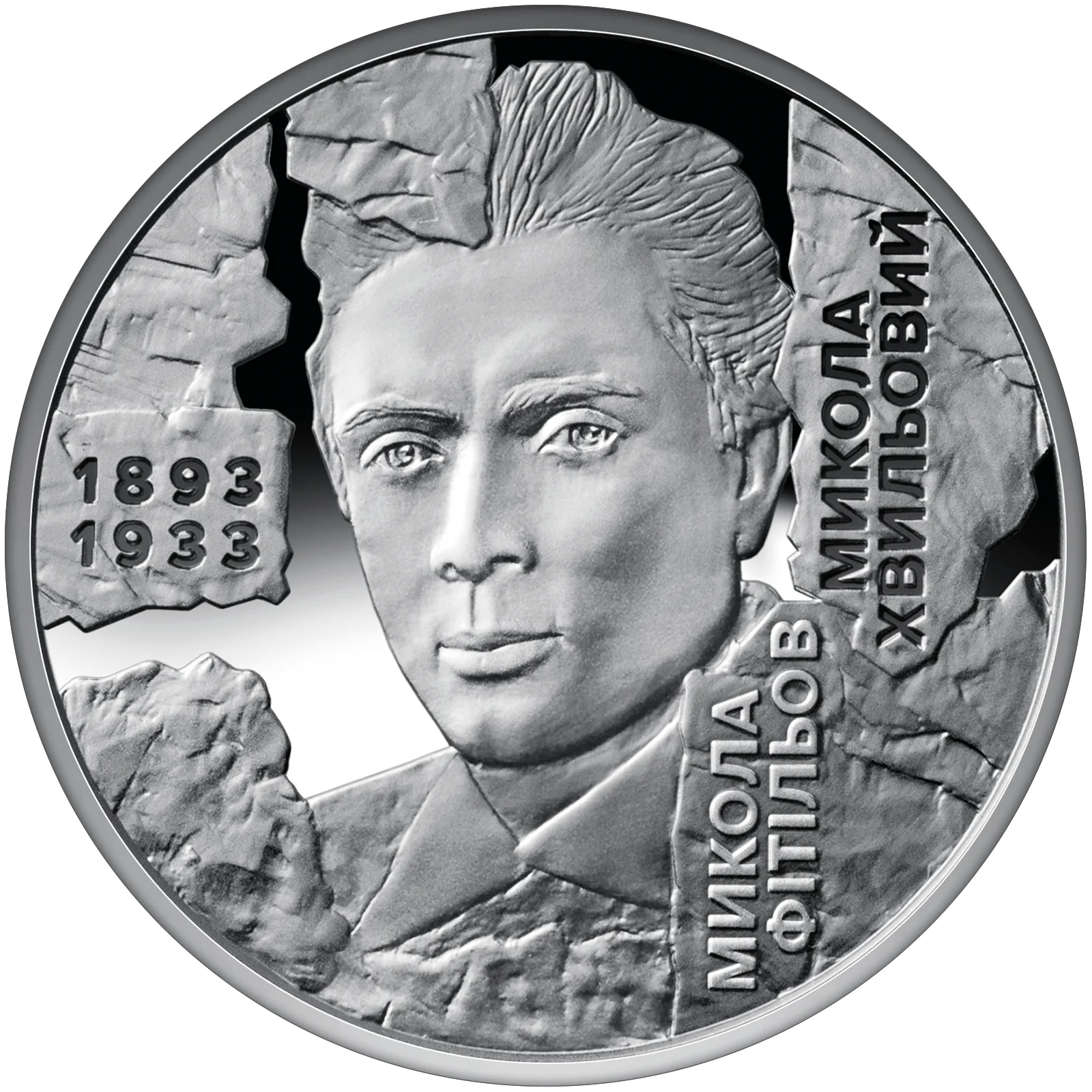 На реверсі монети на дзеркальному тлі зображено стилізований портрет Миколи Хвильового. Символічна композиція передає глибокий зміст: обличчя письменника ніби ув’язнене серед кам’яних плит неправильної форми, що відображають спроби тоталітарного режиму знищити пам’ять про митця. Праворуч від портрета вертикально розташовані написи: МИКОЛА / ФІТІЛЬОВ – справжнє ім’я митця, викарбуване рельєфно, та МИКОЛА / ХВИЛЬОВИЙ – псевдонім, виконаний дзеркально. Ліворуч зазначені роки життя митця – 1893 / 1933.