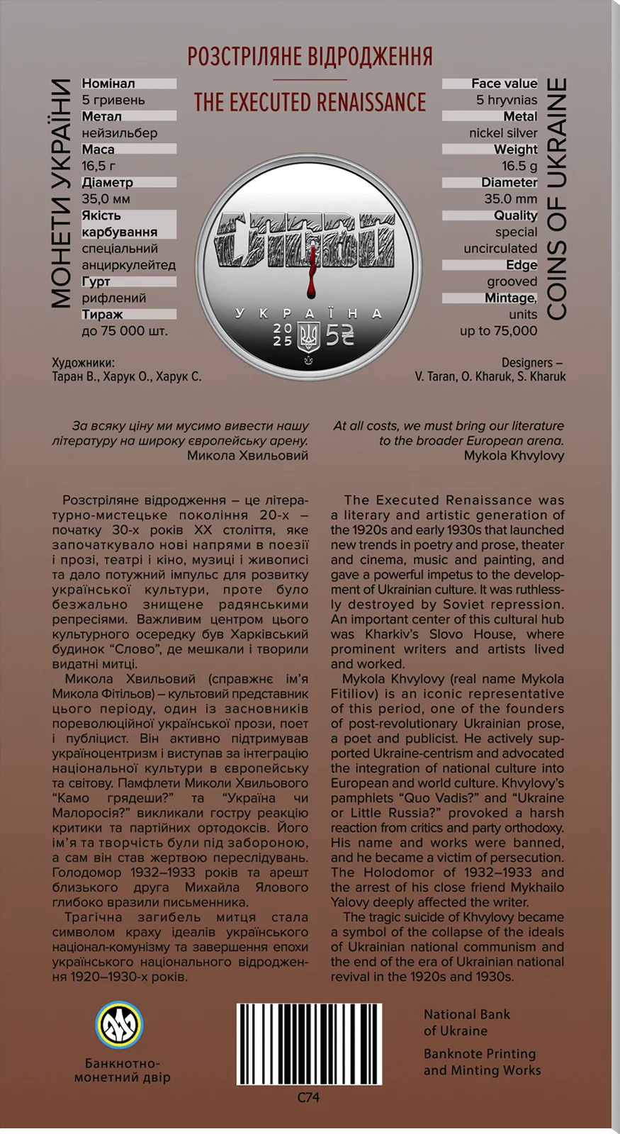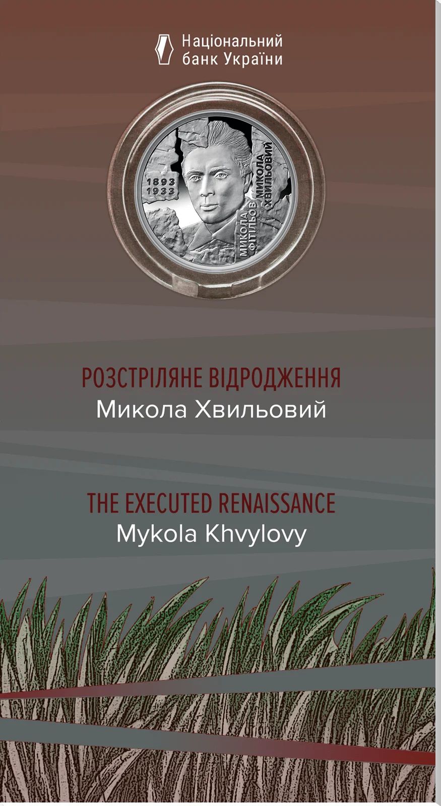 Пам’ятна монета присвячена літературно-мистецькому поколінню України 20-х – початку 30-х років XX століття, яке дало потужний імпульс для розвитку української культури, проте було нещадно репресоване тоталітарним режимом. Важливим культурним центром того періоду став будинок “Слово” в Харкові – осередок творчості та місце трагічних подій, де зароджувалися новаторські погляди, спалахували запеклі інтелектуальні дискусії та народжувалися нові мистецькі течії. Микола Хвильовий (справжнє прізвище Фітільов) – ключова постать культурного відродження, один із засновників української пореволюційної прози, поет і публіцист. Його діяльність сприяла утвердженню україноцентризму й інтеграції національної культури у світовий контекст. Передчасна загибель митця стала символом краху ідеалів українського націонал-комунізму та завершенням епохи українського національного відродження 1920–1930-х років. Ця пам’ятна монета розпочинає тему Розстріляного відродження, вшановуючи внесок Миколи Хвильового та всіх митців, які, попри жорсткий тиск, відважно творили та розвивали українську культуру.