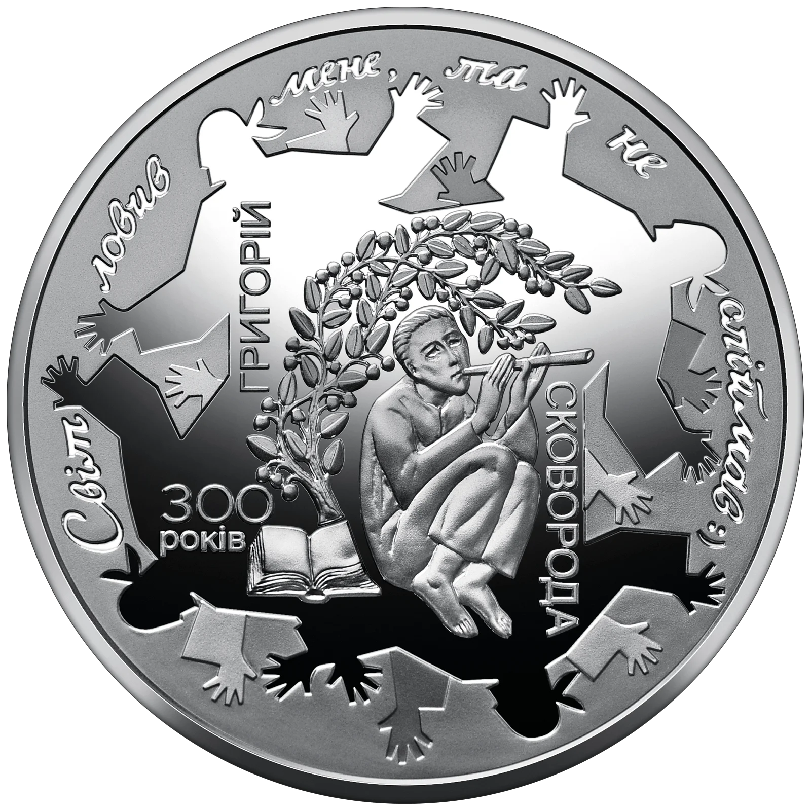 На реверсі монети зображено метафоричну художньо-образну композицію: під деревцем вишні – юнак, який грає на сопілці, поряд – розкрита книга (символічний світ Г. Сковороди); обабіч юнака написи: ліворуч – 300 РОКІВ, ГРИГОРІЙ (вертикально), праворуч – СКОВОРОДА (вертикально); навколо – дзеркальні символічні постаті, що намагаються ухопити філософа, та напис півколом – СВІТ ЛОВИВ МЕНЕ, ТА НЕ СПІЙМАВ :) (угорі).