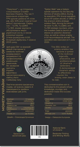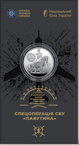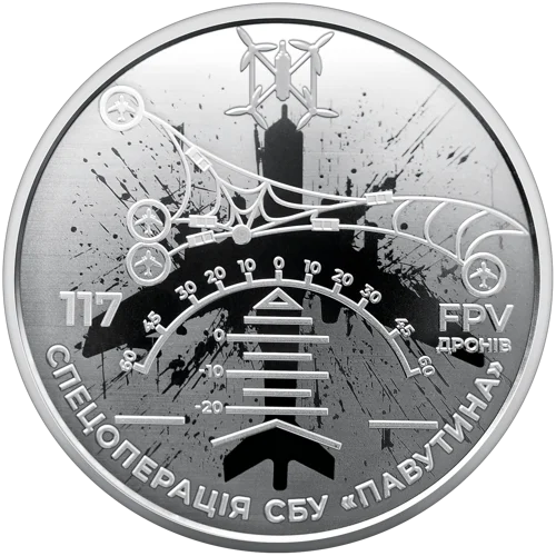 Пам’ятна монета присвячена діяльності Служби безпеки України (далі – СБУ) та її унікальній спецоперації “Павутина” – важливій складовій системи національної безпеки нашої держави. Операція тривала близько півтора року й завершилася 01 червня 2025 року масованою атакою 117 FPV-дронів по чотирьох військових аеродромах ворога. Унаслідок удару було знищено 41 літак російської стратегічної авіації. Цей результат засвідчив спроможність України здійснювати високотехнологічні операції на великій відстані, підтвердивши витривалість, професіоналізм та інтелектуальну міць українських захисників. Пам’ятна монета вшановує героїзм, винахідливість і технологічну майстерність військовослужбовців СБУ, яка в умовах повномасштабної агресії росії проти України демонструє неперевершену здатність захищати суверенітет і територіальну цілісність держави.
