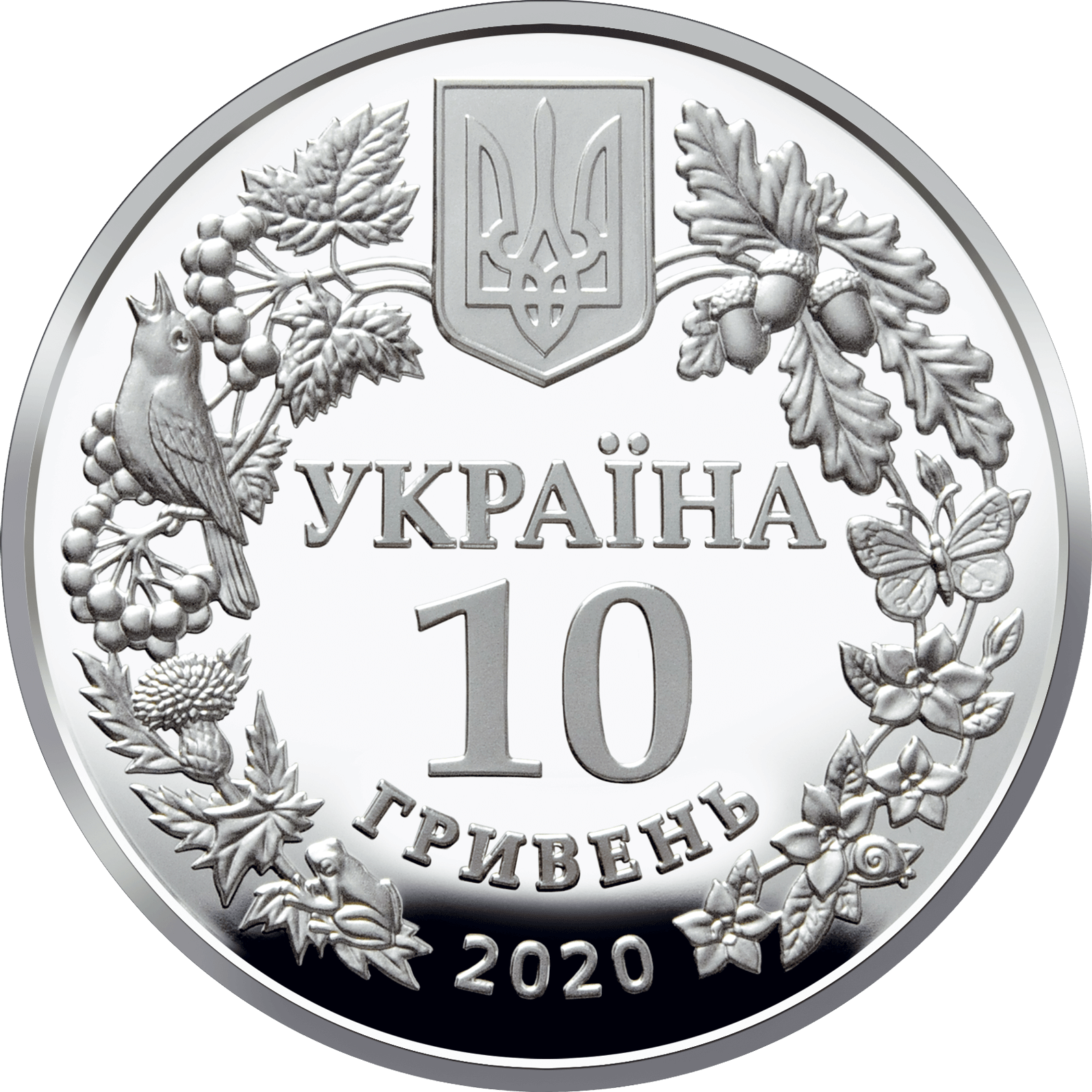 На аверсі монети в обрамленні вінка, утвореного із зображень окремих видів флори і фауни, розміщено малий Державний Герб України та написи: УКРАЇНА/10/ГРИВЕНЬ/2020.