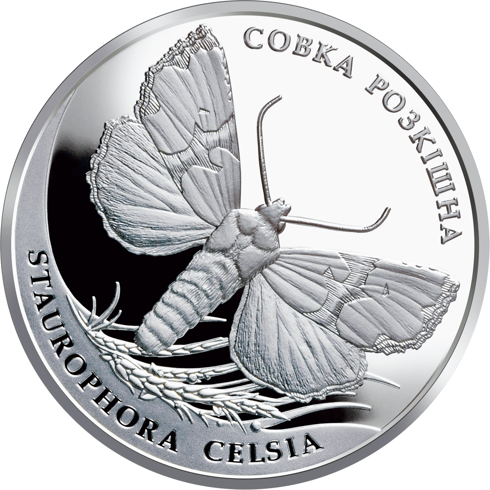 На реверсі монети на дзеркальному тлі зображено совку розкішну та написи півколом: СОВКА РОЗКІШНА (угорі праворуч), STAUROPHORA CELSIA (унизу ліворуч).