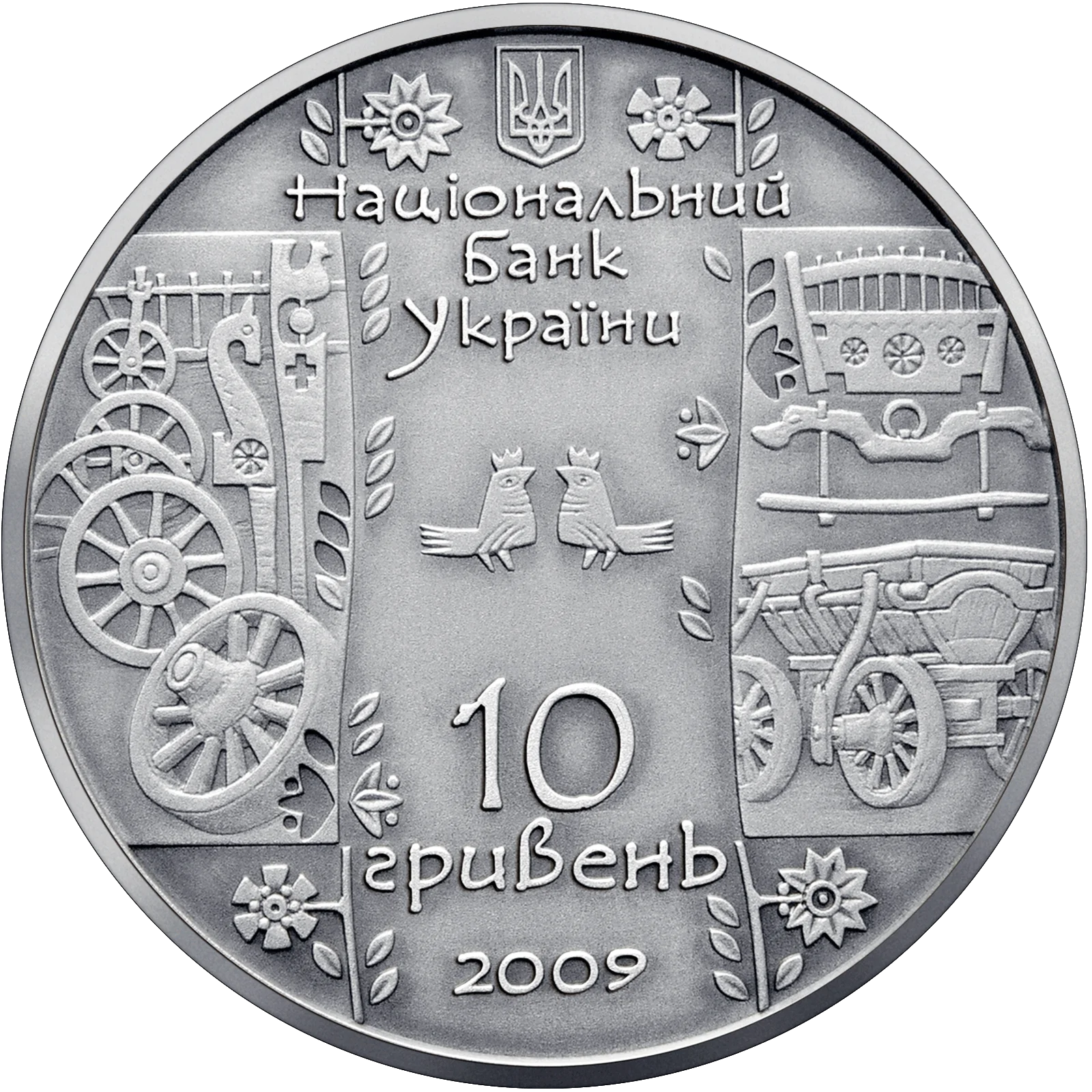 На аверсі монети розміщено: угорі малий Державний Герб України, під яким стилізований напис - НАЦІОНАЛЬНИЙ/БАНК/УКРАЇНИ, у центрі - стилізоване зображення двох півників, ліворуч і праворуч - продукція стельмаського ремесла - вози, ярма, колеса, сани, притика. Декоративна орнаментальна центральна частина аверсу містить написи - 10/ ГРИВЕНЬ/ 2009.