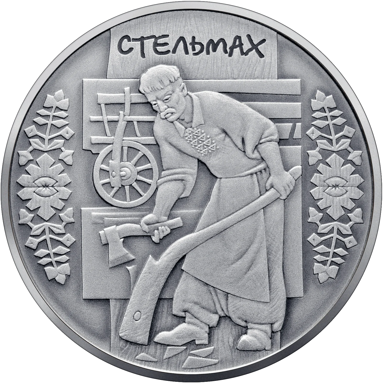 На реверсі монети зображено деревообробника, який теше з дерева деталь воза. Угорі на тлі стилізованої дошки розміщено напис СТЕЛЬМАХ, обабіч центральної композиції зображено декоративний орнамент.