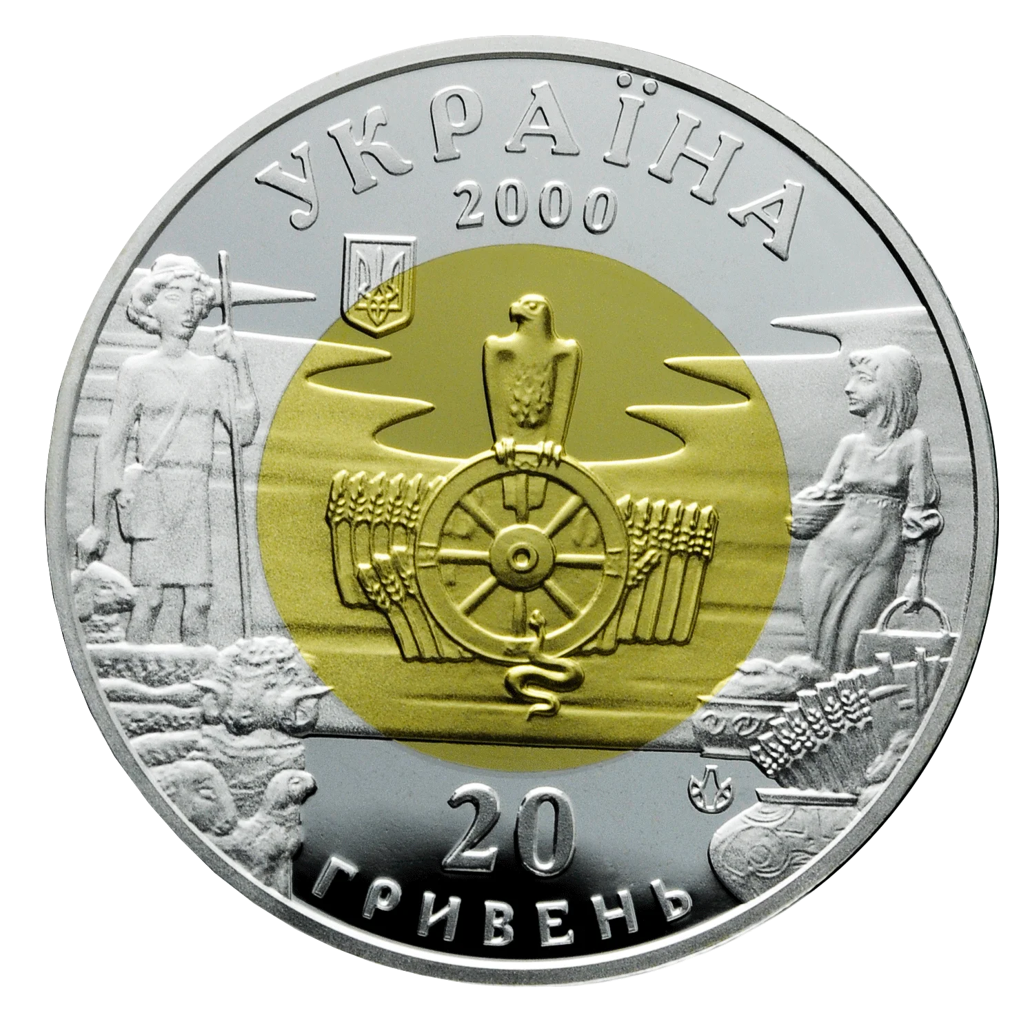 На аверсі монети у внутрішньому колі в центрі на тлі житнього колосся зображено символічне колесо історії, на якому сидить сокіл, а внизу – змія, угорі ліворуч розміщено малий Державний Герб України; у зовнішньому колі зображено хлопчика-пастуха – ліворуч та дівчинку з колосками – праворуч як представників скотарських та землеробських племен, логотип Монетного двору і написи: УКРАЇНА / 2000 / 20 / ГРИВЕНЬ /
