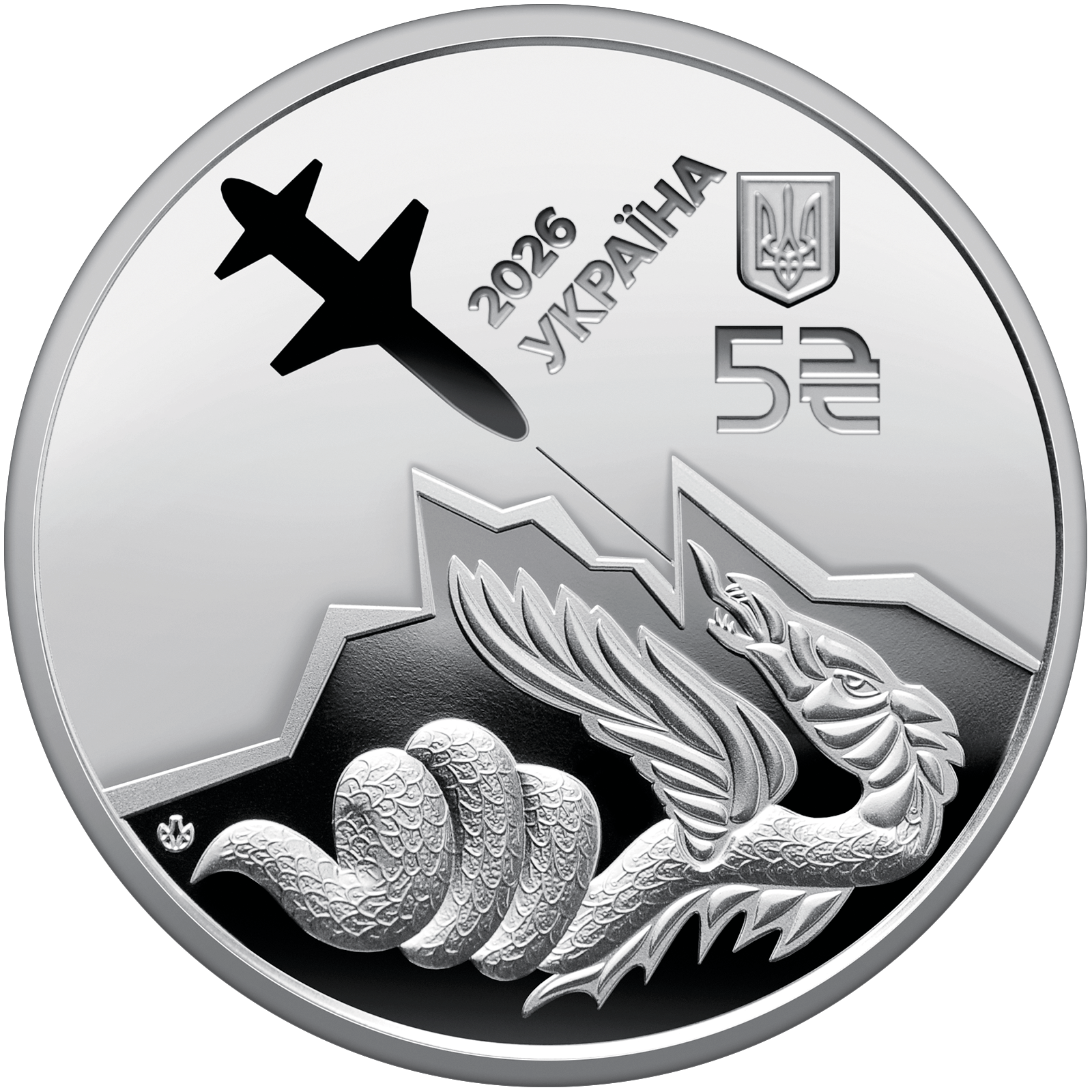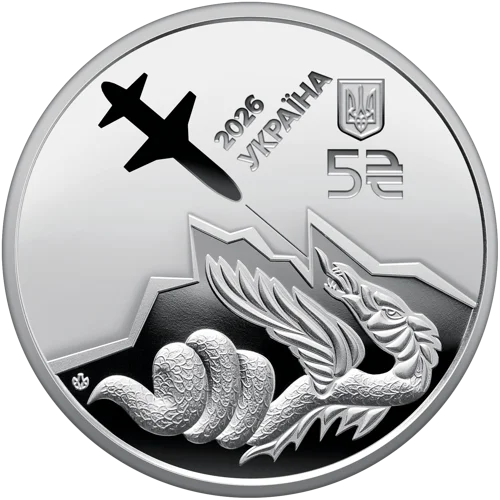 На аверсі монети зображено стилізований силует ракети-дрона “Паляниця”, що вражає змія. У верхній частині композиції зазначено: напис УКРАЇНА, номінал 5 та графічний знак гривні, рік карбування монети – 2026. Унизу ліворуч розміщено логотип Банкнотно-монетного двору Національного банку України.
