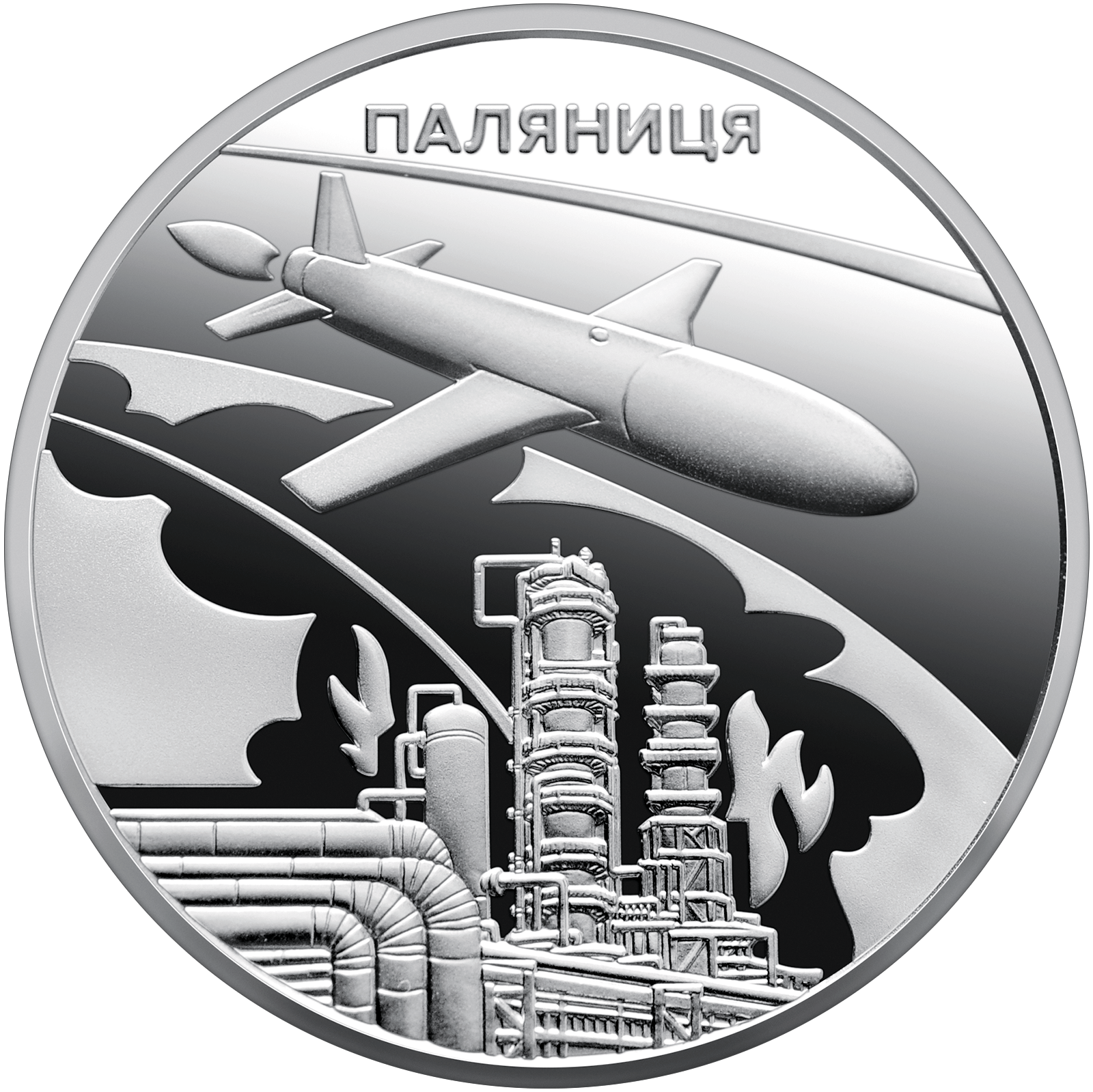 На реверсі монети зображено атаку української далекобійної ракети-дрона на об’єкт паливно-енергетичного комплексу країни-агресора. Угорі – напис ПАЛЯНИЦЯ.