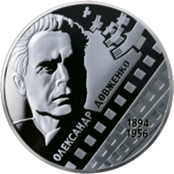 На реверсі монети зображено: портрет Олександра Довженка (ліворуч), напис ОЛЕКСАНДР ДОВЖЕНКО (по діагоналі), на тлі кіноплівки роки життя - 1894/1956 (праворуч), угорі - стилізованих птахів, що уособлюють поетичні мрії художника.